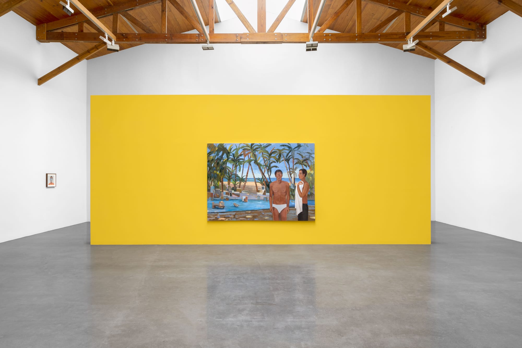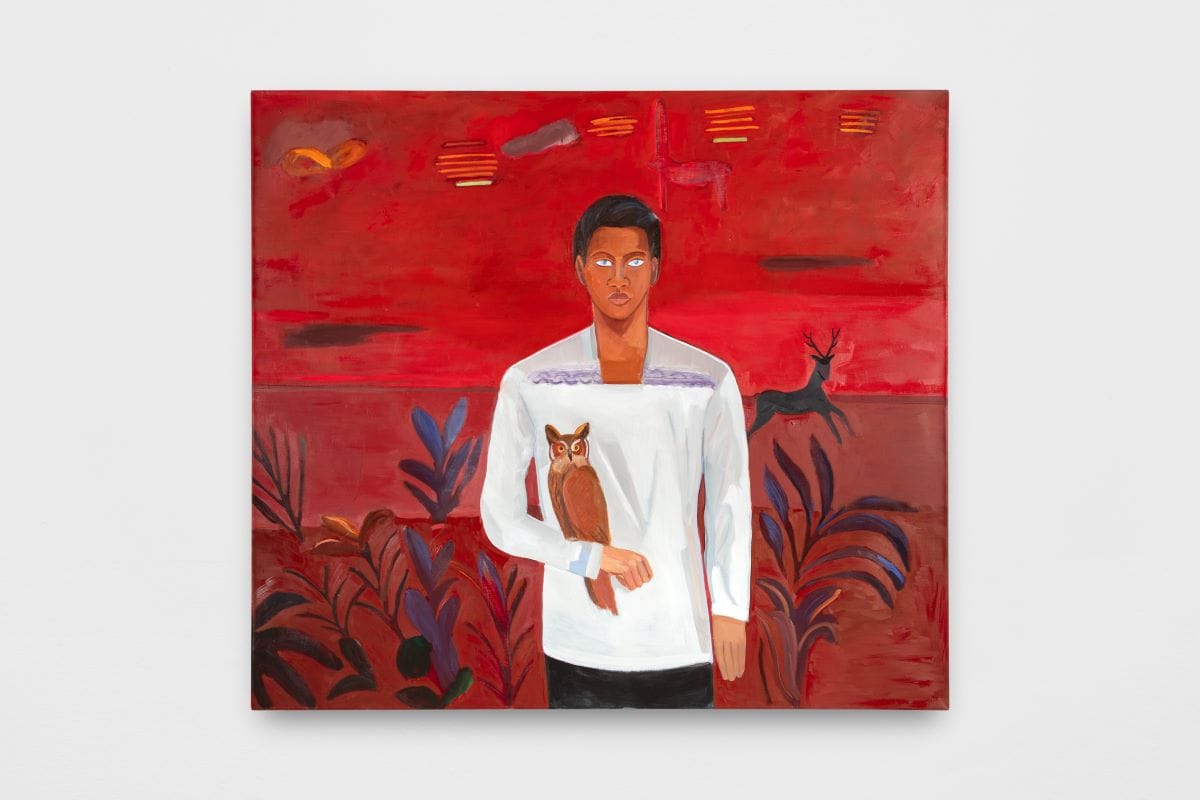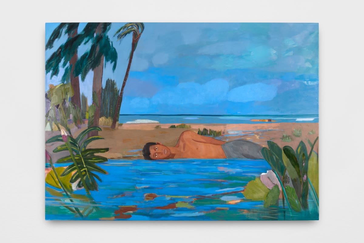 The men and boys in Gil de Montes’s works are almost always still, in frontal view, and staring out at viewers with a soft poignant gaze. They appear realistic in form but their function within the broader landscape almost always feels disjointed, like misfits on the flat picture plane. At first glance, the human body, and all that surrounds it, may appear two dimensional, but soon this turns into a rippling abstraction that’s submerged under water. For “Echo Park” (2022) and “San Sebastián del trópico” (2022), the artist dexterously uses light and shade to stretch the possibilities of figuration on a flat surface.