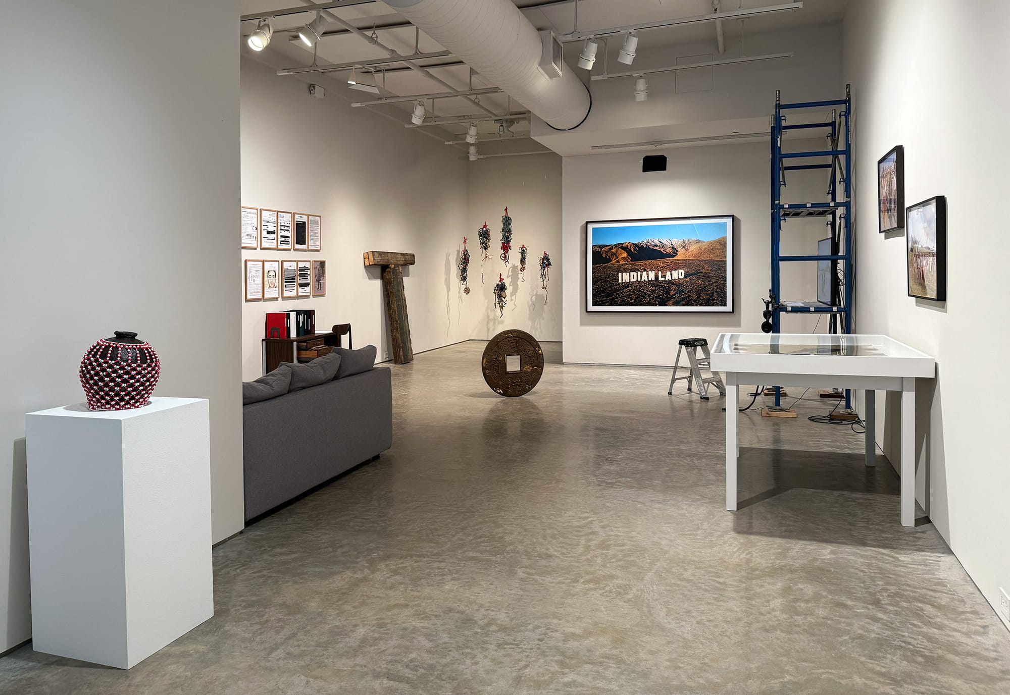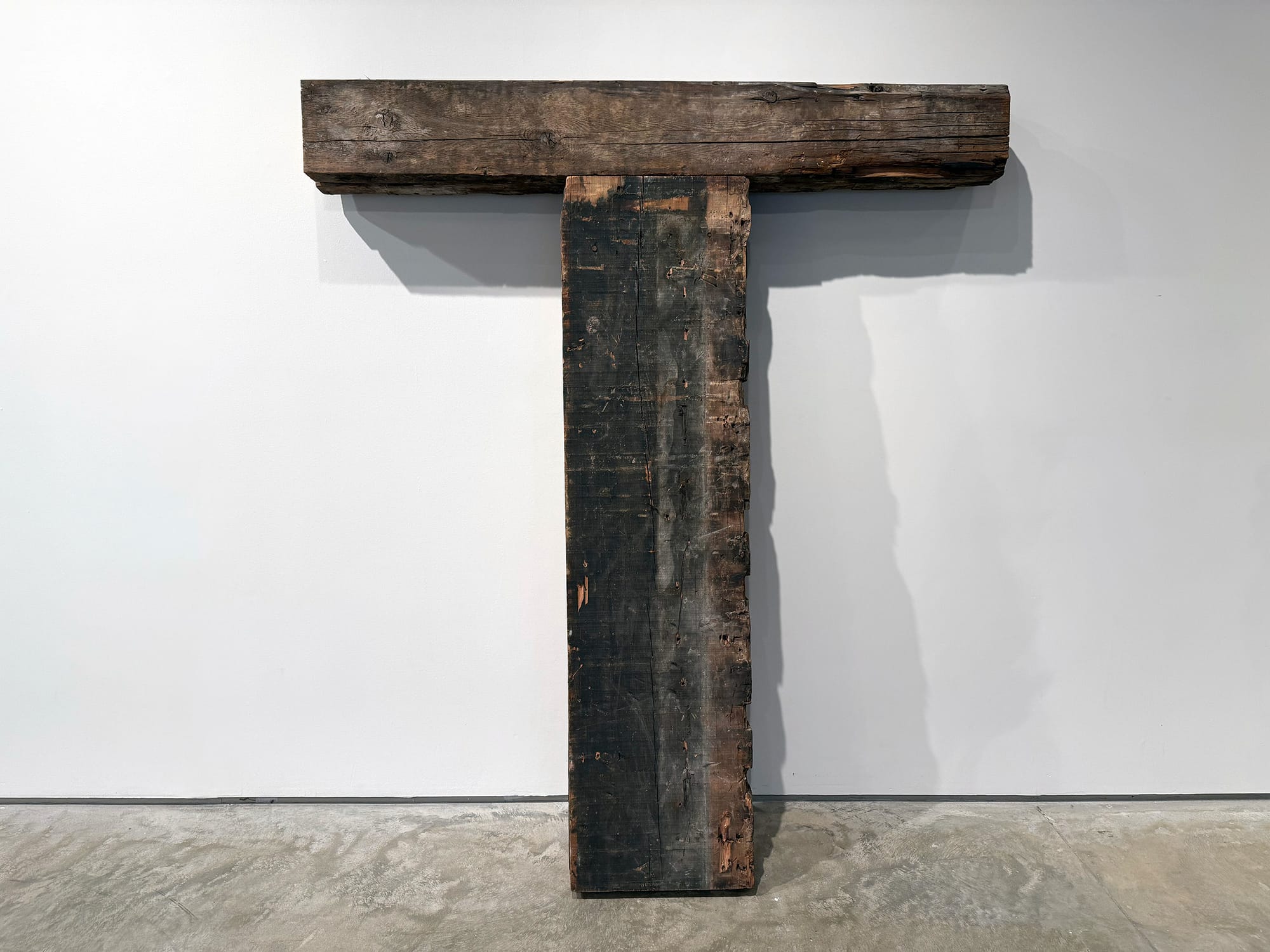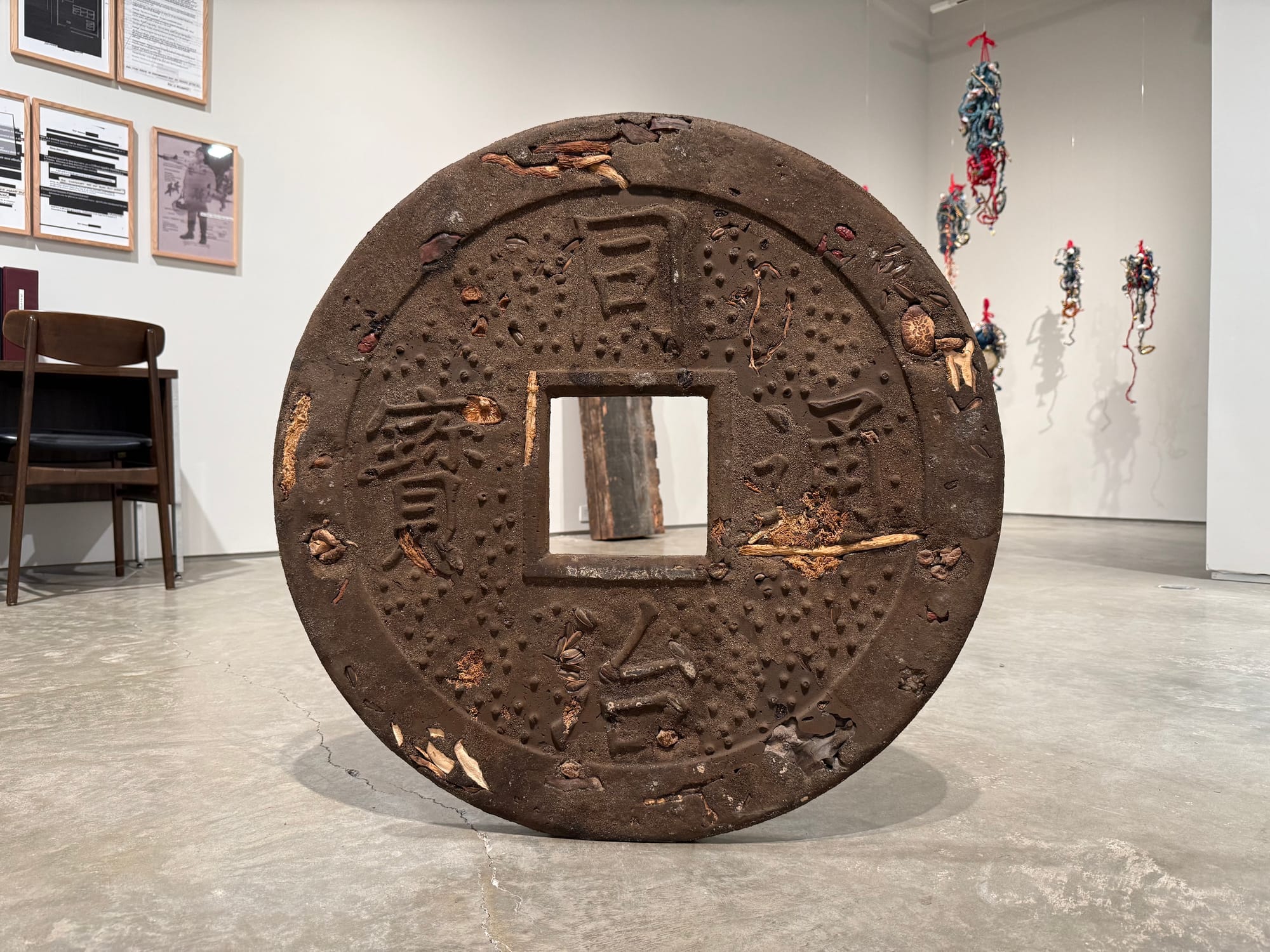 This exhibition trades in art’s auratic power; its objects assert the power of collective memory. Kenneth Tam’s “Why Do You Abuse Me” (2022) consists of the earth from sites along the Transcontinental Railroad, where many Chinese laborers died amid perilous working conditions and low wages in the 1860s. Embedded with dried fruits, seeds, mushrooms, and other sources of physical and spiritual nourishment, and standing almost preternaturally erect on one coin-edge to block your path, the piece feels almost alive. Meanwhile, Kris Grey’s “Capital T” (2025) consists of weathered wooden beams that I initially read as a crucifix; I could feel their weariness, the burden of persecution. Only upon reading the curatorial essay did I learn that it was salvaged from the dance floor of the original Stonewall Inn, the site of one of the most pivotal rebellions in queer history. Suddenly, an event I'd encountered only through repeated historical reference was startlingly, physically present.