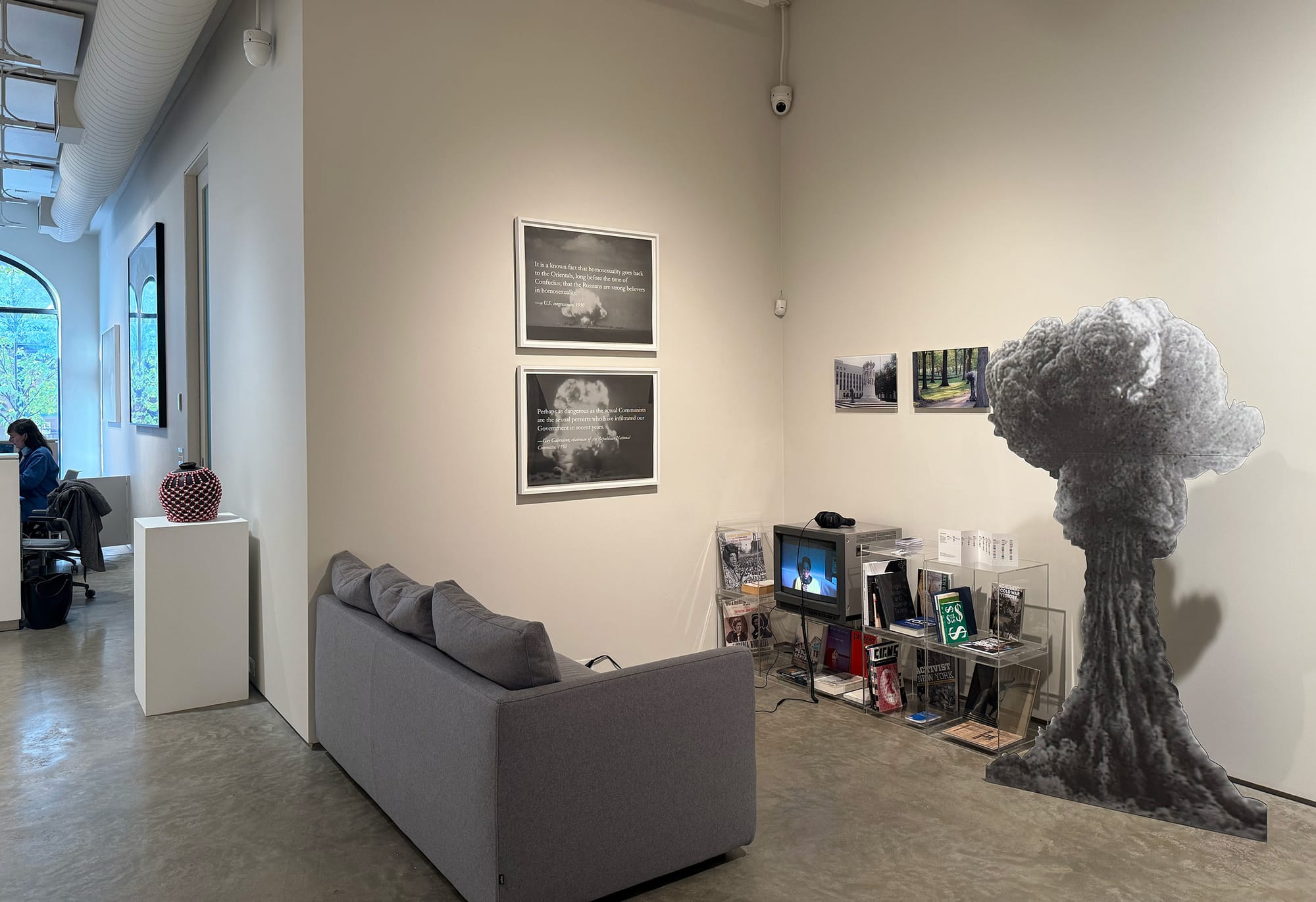 One notable — and slightly unusual — emphasis in this show is on recreations and reenactments, suggesting that there are more impactful ways to tell the truth than simply recounting what happened and offering another channel to feel history in the now. The late Nona Faustine’s “Dorothy Angola, Stay Free, In Land of the Blacks, Minetta Lane, the Village, NYC” (2021), for instance, brings the deeply buried history of one of the first enslaved women trafficked here by the Dutch West India Company in the 1600s back to the fore by embodying her ghost: Faustine stands in the center of a former semi-free Black settlement in all white, looking straight into the camera. Mark Tribe’s Port Huron Project (2006–8) documents reenactments of iconic protest speeches on location; hearing the same words spoken in the same space, you feel the presence of past audiences and part of the same movement as them — a thread continued by Andrea Ray’s "The Sound of Women’s Rights" (2020/25), which interweaves voices from the 1970s with those of the past decade.