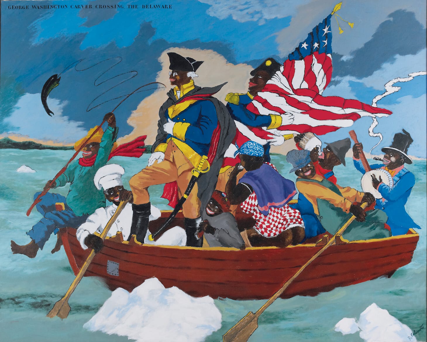 Where does protest art fit in the “canon” of contemporary art? Certainly it can illuminate the past, as Horowitz’s curation shows. Malaquías Montoya’s portrait of “Cristobal Colón” (1992) commemorates the 500th anniversary of Columbus’s voyage in a macabre lithograph that reveals parts of the colonizer’s skull. Robert Colescott’s “George Washington Carver Crossing the Delaware” (1975) picks on the kinds of revisionism recently exemplified by Hamilton, reframing Emanuel Leutze’s famed painting using racist stereotypes from minstrel shows.