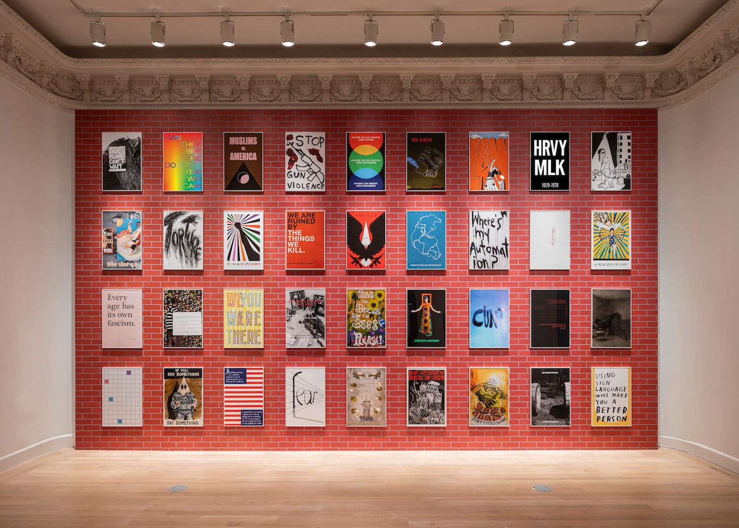 On another wall, Horowitz displays 36 prints commissioned from contemporary artists like Marilyn Minter, Baseera Khan, Rico Gatson, and Kim Gordon. Christine Sun Kim, who is deaf, contributed a minimalist yellow design that reads, “Using Sign Language Will Make You a Better Person.” Hương Ngô overlays the phrases “You Are Here” and “We Were There” to juxtapose tourism with colonial displacement. Arranged in a pristine grid across exposed brick, these sleek and colorful protest posters seem ready-made for sharing online and show how mainstream the medium has become.