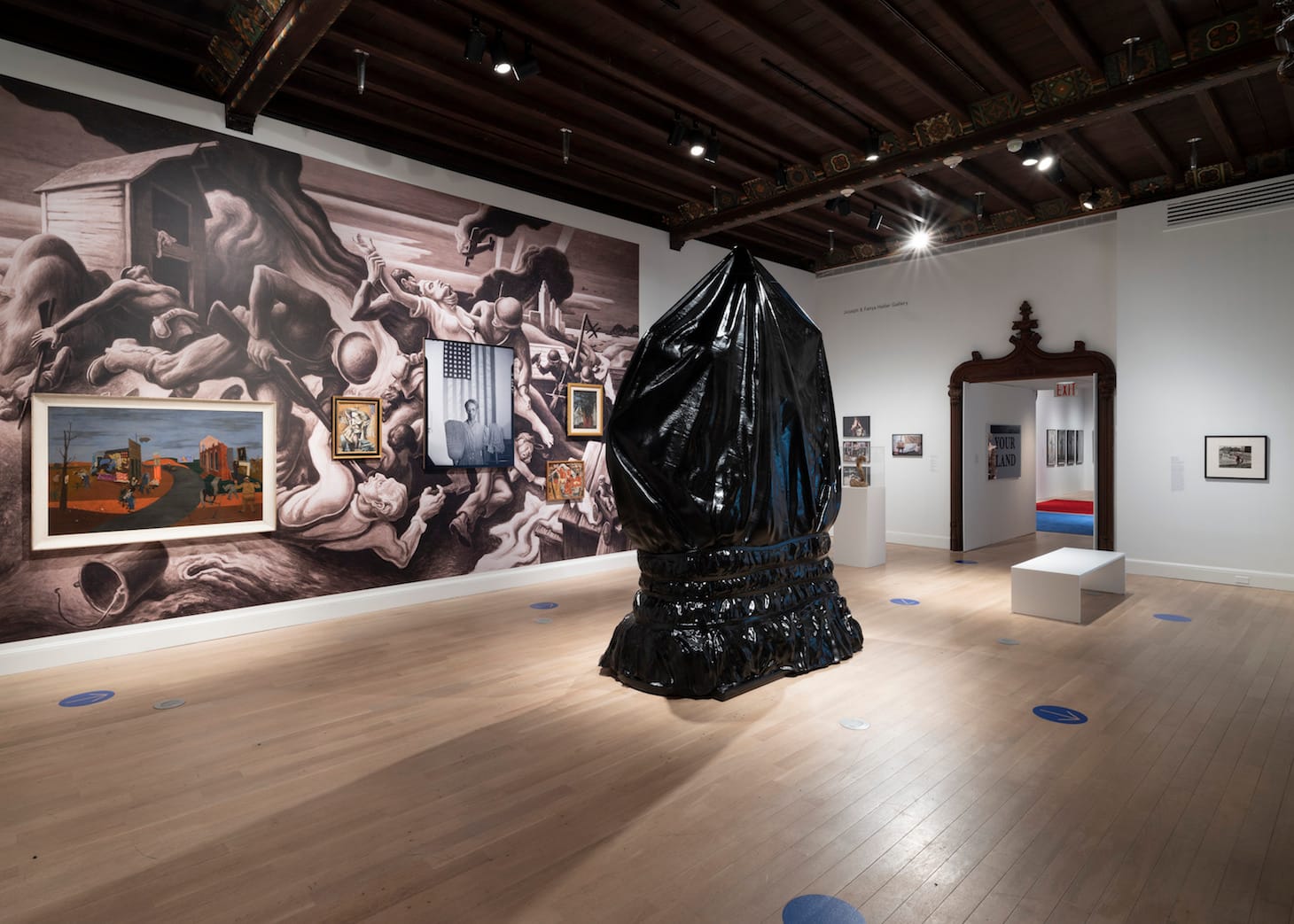 Across one gallery wall, Horowitz embeds a blown-up reproduction of Thomas Hart Benton’s “Invasion” (1942) — a pro-war propaganda painting of Japanese soldiers attacking unarmed white victims — as a backdrop for scenes of racialized violence. Henry Sugimoto’s “Nisei Babies in Concentration Camp” (1943) appears alongside a Klan lynching painted by Philip Evergood and Gordon Parks’s iconic “American Gothic” (1942) portrait. Nearby, a hulking black sculpture by Horowitz takes the form of Charlottesville’s Robert E. Lee monument, which was briefly wrapped in a black tarp following the fatal Unite the Right rally in 2017.