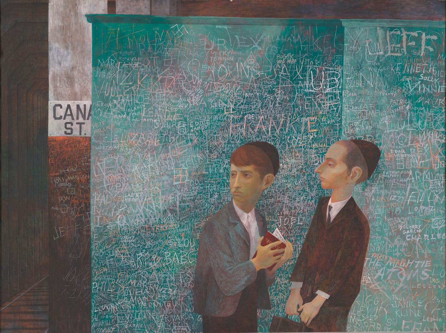 It seems hard to imagine now, but there was a brief period in the mid-20th century when the US government recruited artists to join in their ideological warfare against fascism. One of these artists, Bernard Perlin, achieved worldwide recognition for his painting “Orthodox Boys” (1948). Two Jewish kids stand at the Canal Street subway station in Manhattan, near a wall covered with random names, Stars of David, hearts, and swastikas. By the late 1940s, the CIA had already begun employing disgraced Nazi generals to consult on Soviet affairs, thus weaving Nazism into the fabric of postwar American culture, and making Perlin a bit of a visionary.