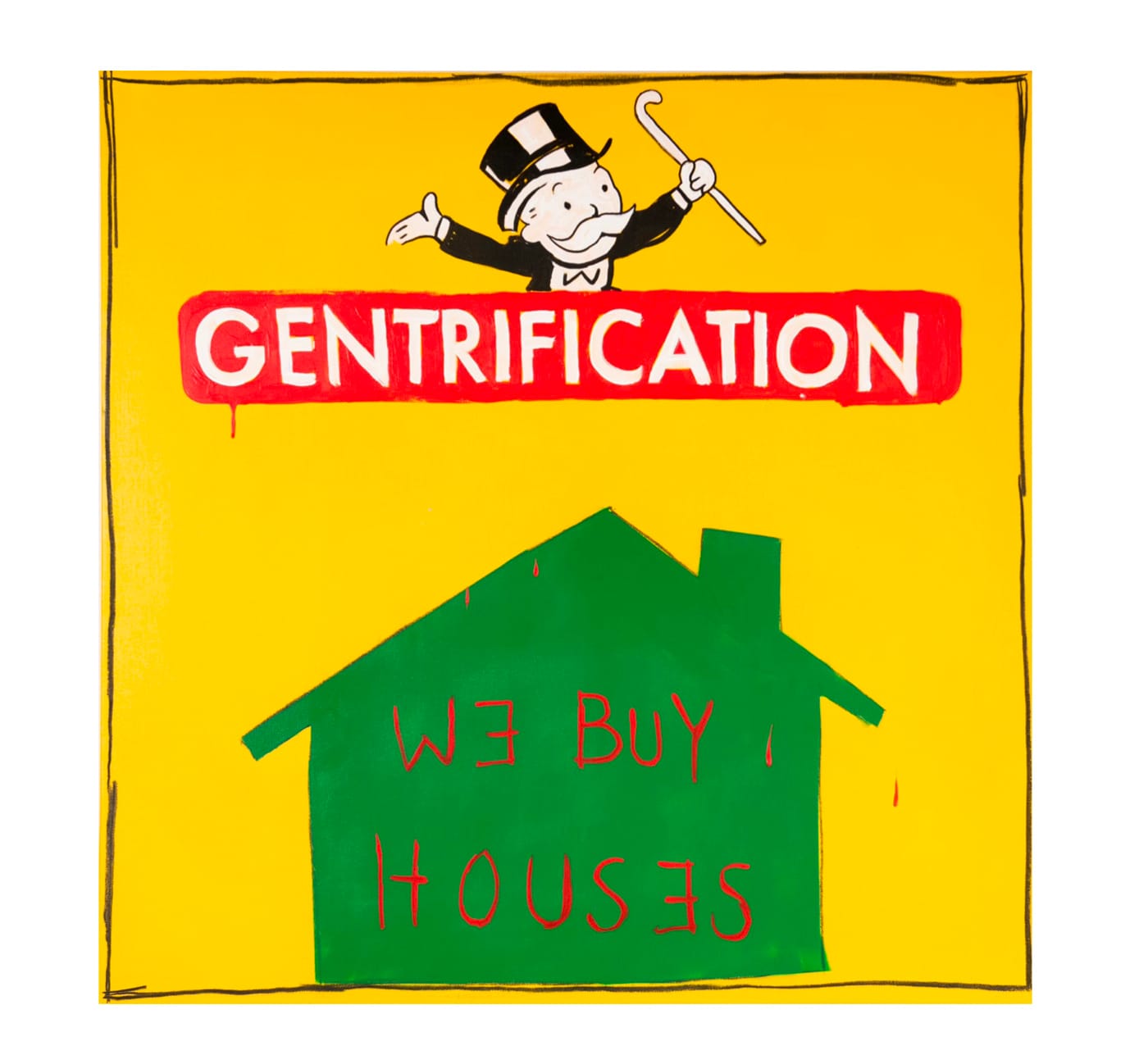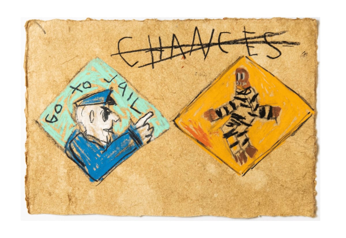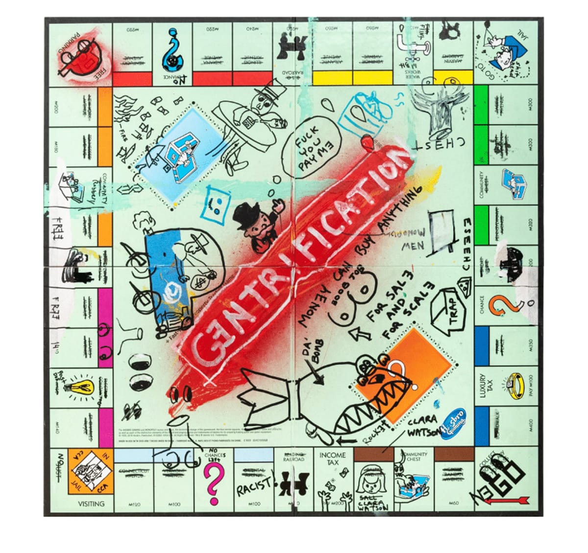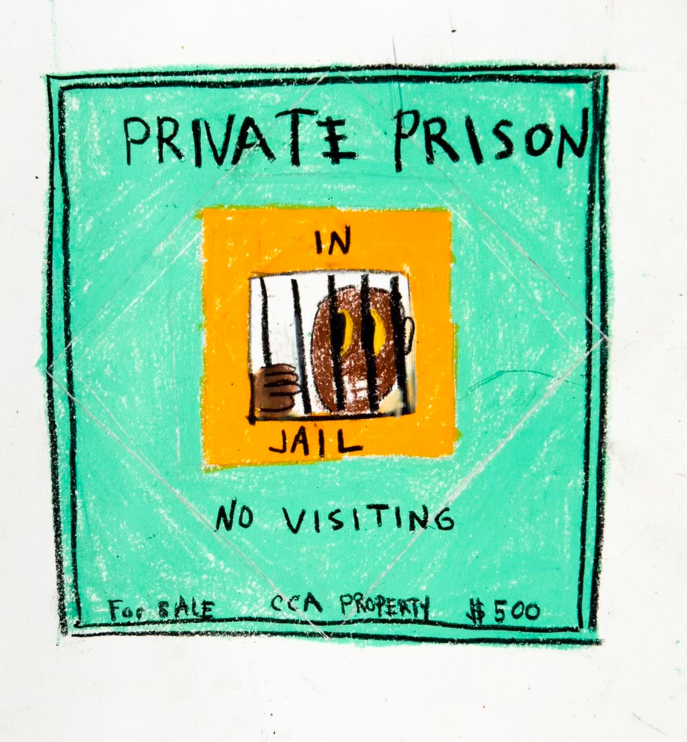 Throughout the work, the artists deploy signature Monopoly motifs, from the red and green housing tokens to twists on the famous corner squares and pull-cards. “Chance” becomes “Never Had A Chance,” “Free Parking” features a double-booted abandoned vehicle, and of course, there are several variations on “Go to Jail.”