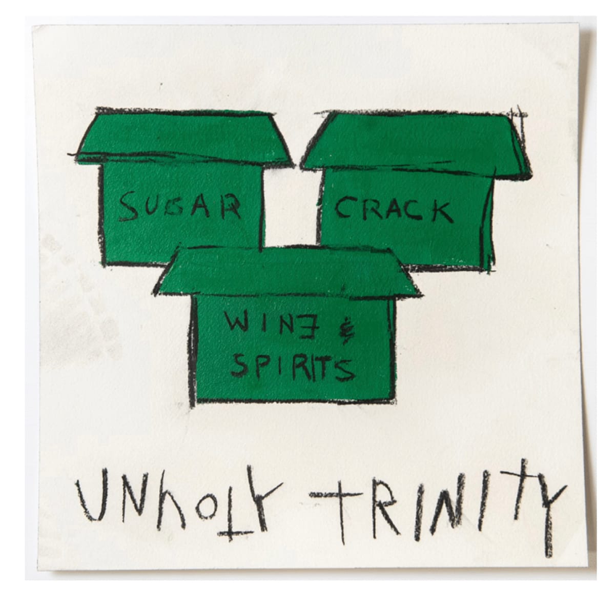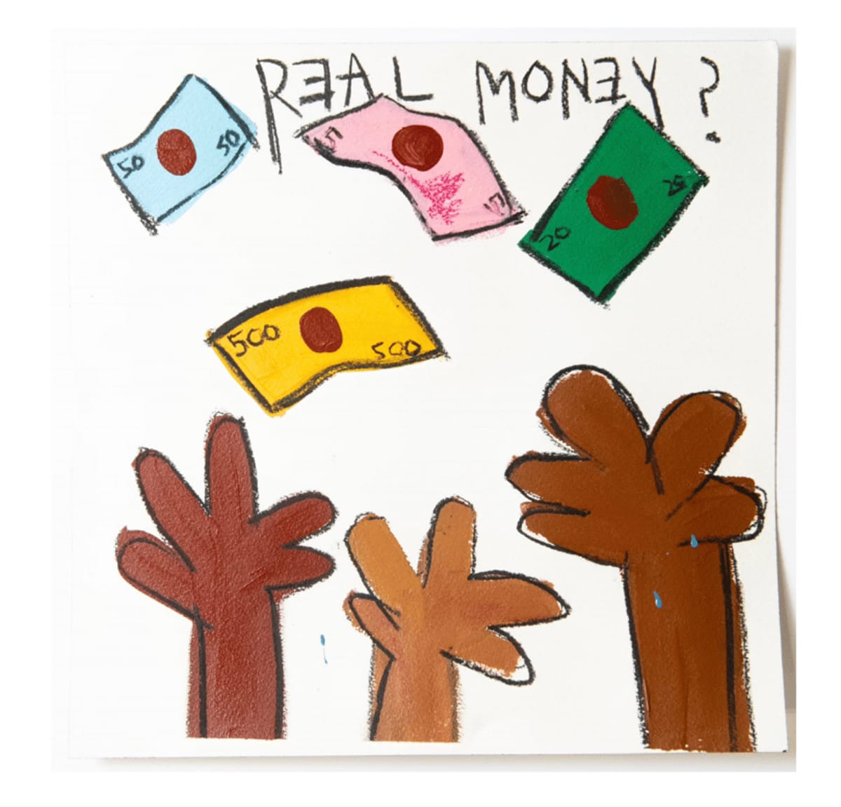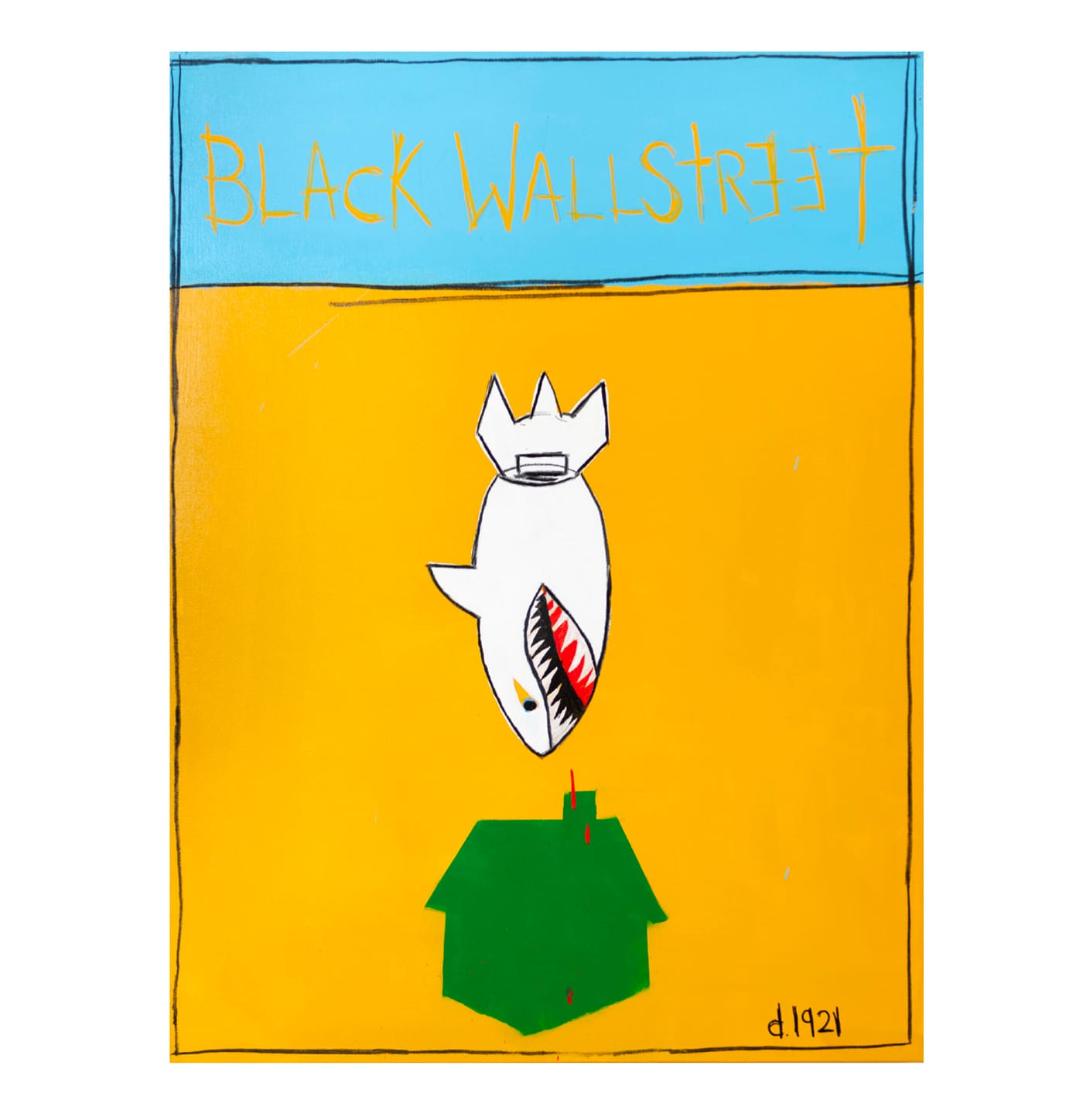 Throughout the work, the artists deploy signature Monopoly motifs, from the red and green housing tokens to twists on the famous corner squares and pull-cards. “Chance” becomes “Never Had A Chance,” “Free Parking” features a double-booted abandoned vehicle, and of course, there are several variations on “Go to Jail.”