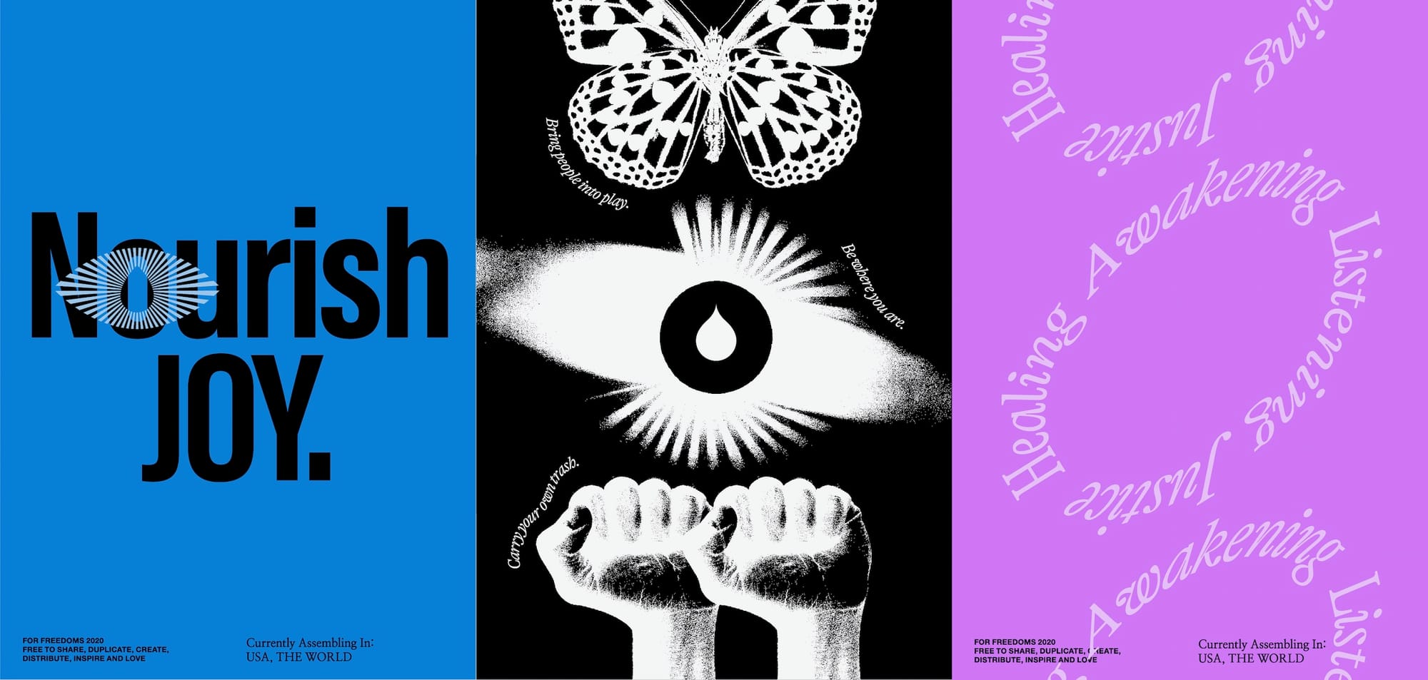The soft power of creative expression has proven effective to invigorate support behind a common cause or candidate. Alexandria Ocasio Cortez’s 2018 campaign design abandoned traditional political brand identities; the AOC aesthetic is now a recognizable tool that signals progressive platforms. In 2018, artist collective For Freedoms launched a nationwide initiative utilizing billboards to promote civic engagement by showcasing the work of contemporary artists. This year they launched the decentralized social justice movement, Wide Awakes and published the Infinite Playbook, a digital toolkit for civic engagement pursuing their long-term goals of building a political and cultural identity around listening, healing, justice, and awakening.