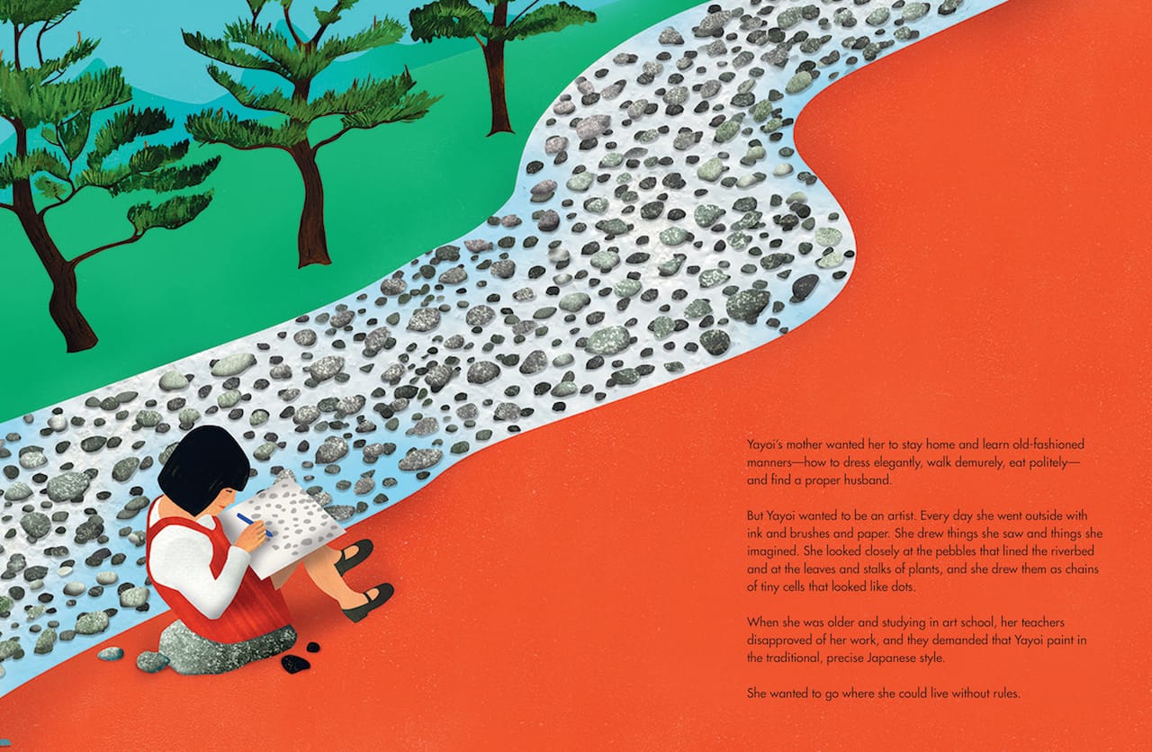 Much of the success of Infinity stems from its masterful illustrations, which are inspired by Kusama’s style but don’t parrot it. Weinstein works in the language of visual repetition from the first page, using the stones beneath a temple in the Japanese city of Kusama’s birth to introduce the idea of small, repetitive pieces comprising a visual whole. Suzuki’s narrative explains that while Kusama’s parents and art teachers wanted her to follow a traditional path in life and in art, she was drawn to representing the world around her on the granular level. Suzuki writes, “She looked closely at the pebbles that lined the riverbed and at the leaves and stalks of plants, and she drew them as chains of tiny cells that looked like dots.” Something as simple as the close observation of nature is radical in this context.