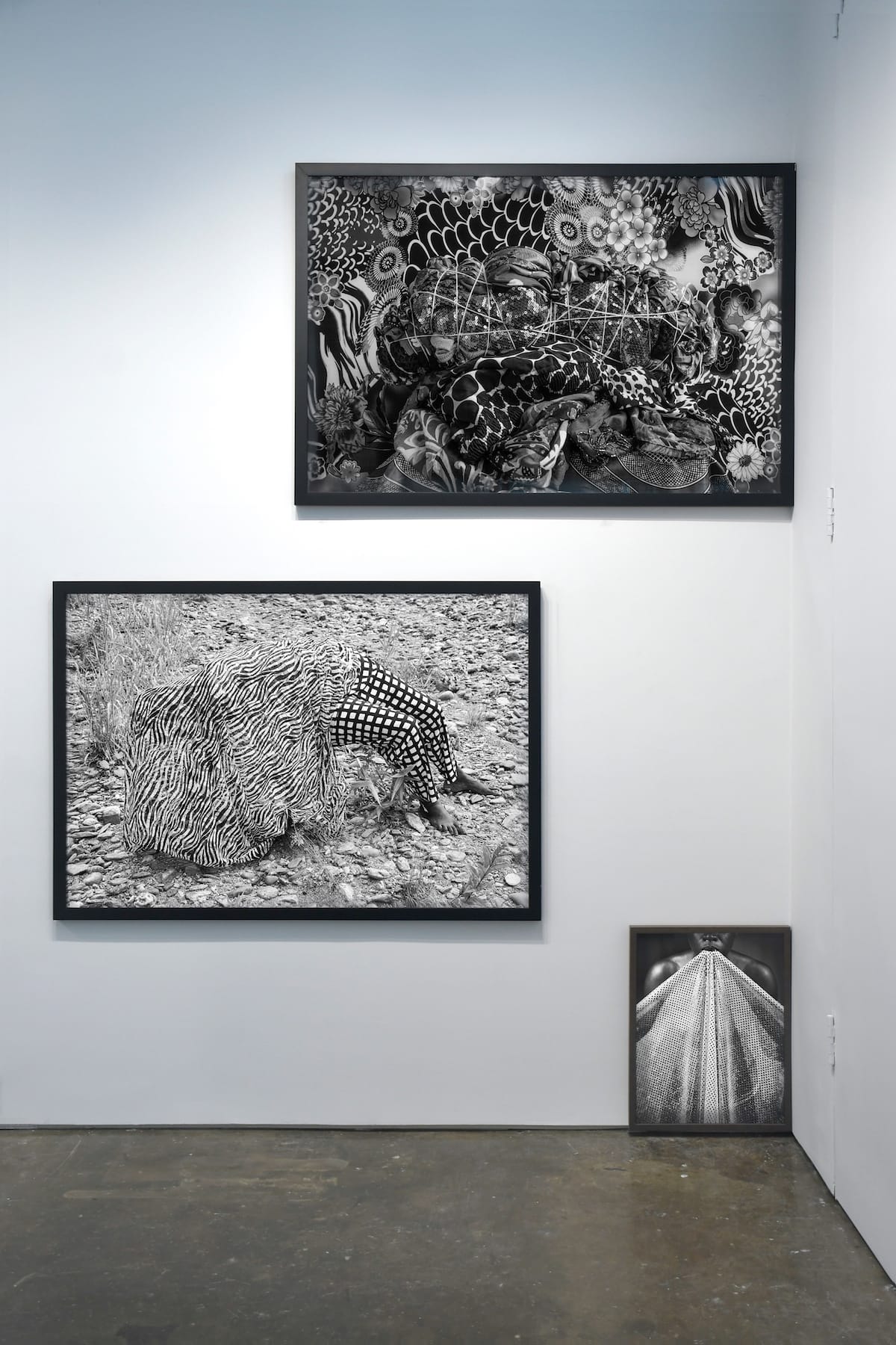 The featured works draw viewers in closer, enticing with the promise of an intimate reveal while maintaining a critical distance through their reliance on symbolism or abstraction. In three black and white photographs of varying sizes from Keisha Scarville’s ongoing series Mama’s Clothes, for example, clothing acts as a surrogate for the artist’s late mother, allowing Scarville to surrender completely to her weight or hold her delicately in her mouth. Somewhere between portraits and still lifes, the photographs are meditations on loss which conjure new relationships to other realms.