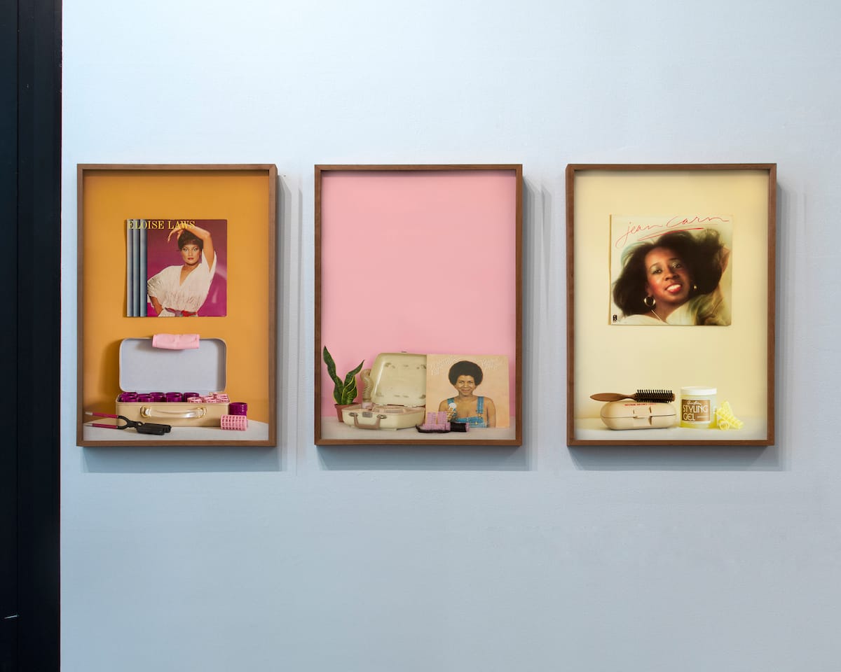 This theme of embodiment through objects is reflected across the gallery space in a trio of images by Nakeya Brown, whose work focuses on the politics of black beauty and womanhood through still life images, as well as AK Jenkins’s self-portraits in the next room, which use sports paraphernalia to open up questions around gender/masculinity.