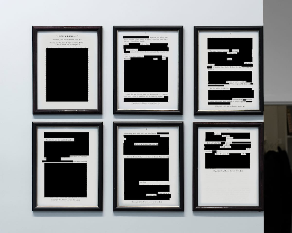 Some of the featured images use literal masking to project intimacy or familiarity without revealing too much. Clifford Prince King’s photographs of quotidian moments, for instance, speak clearly of Black queer desire while also enshrouding his subjects in mystery through his framing and composition. Similarly, Faith Couch’s installation represents Martin Luther King’s famous speech from the March on Washington as a photograph of a moment. Employing redaction — famously associated with the FBI’s own surveillance of the Civil Rights leader — Couch’s appropriation highlights King's rage and indignation above calls for peace.