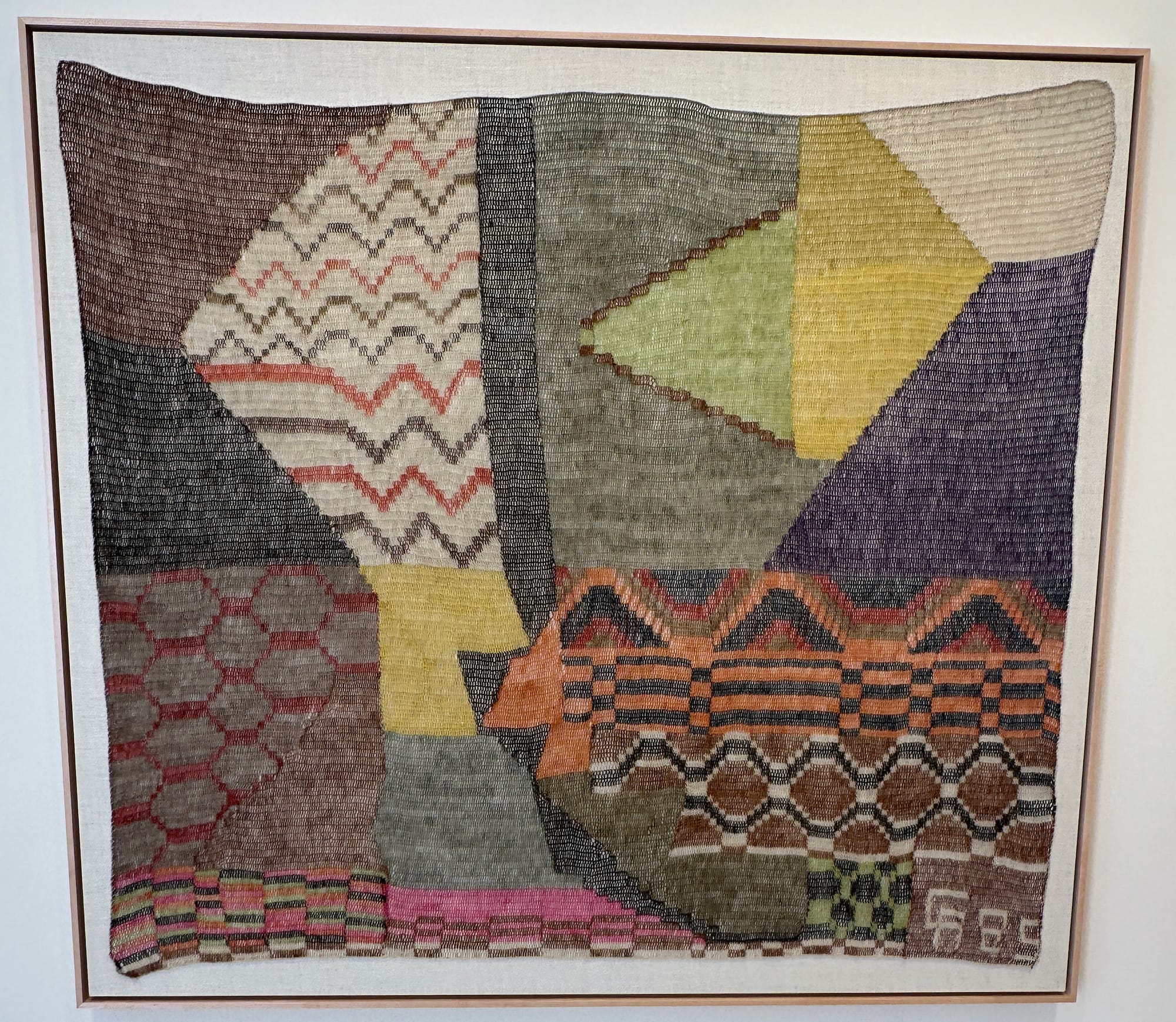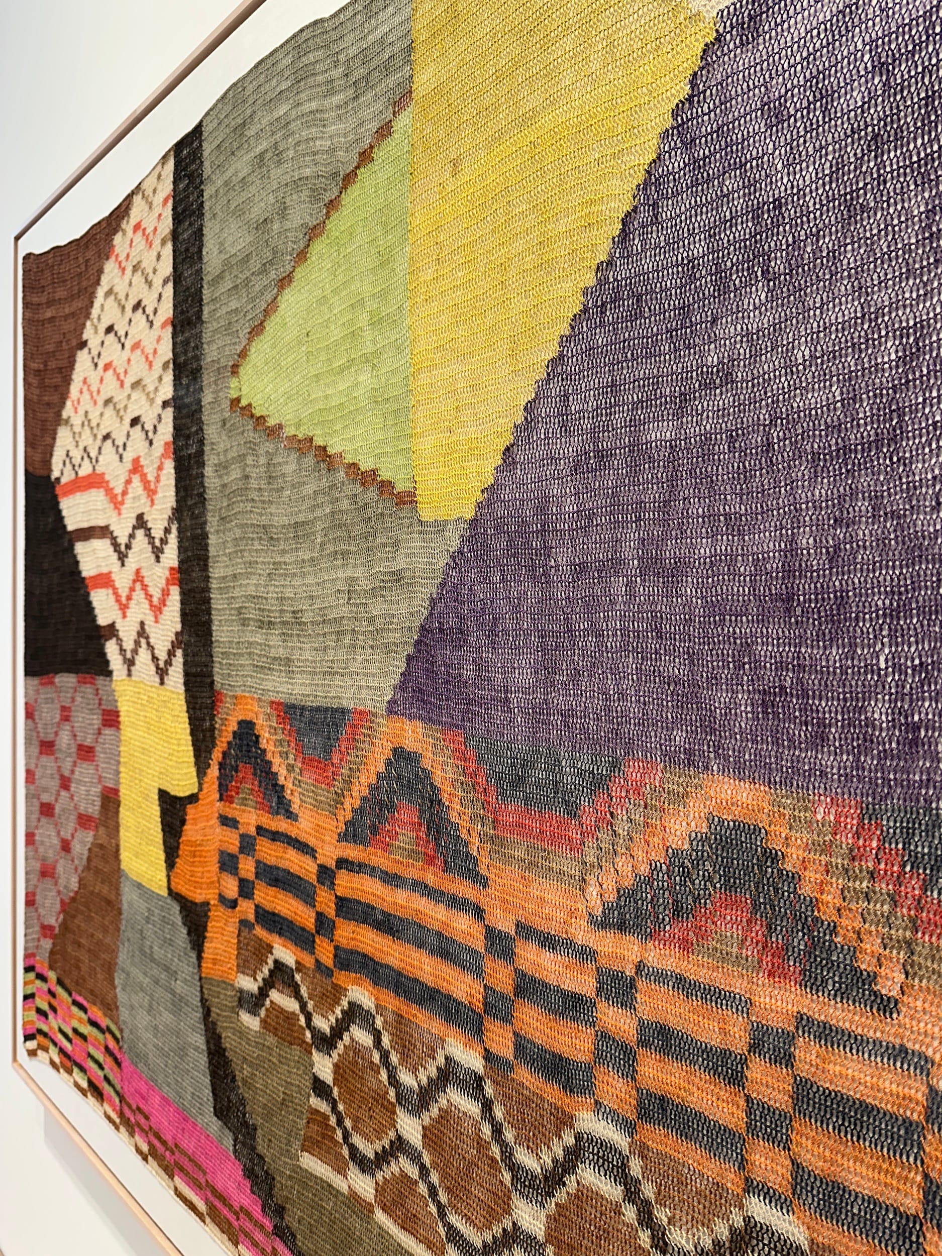 With its irregular geometric shapes and zigzagging bands in multiple colors, “Los caminos de la presencia wichí” (The paths of the Wichí presence) (2024) feels like a voyage, or perhaps several ones, not a static artwork. It’s good to look from afar, up close, and from the sides at its fluctuating shapes and color gradations. This work feels very generous and soulful, as do the others.
