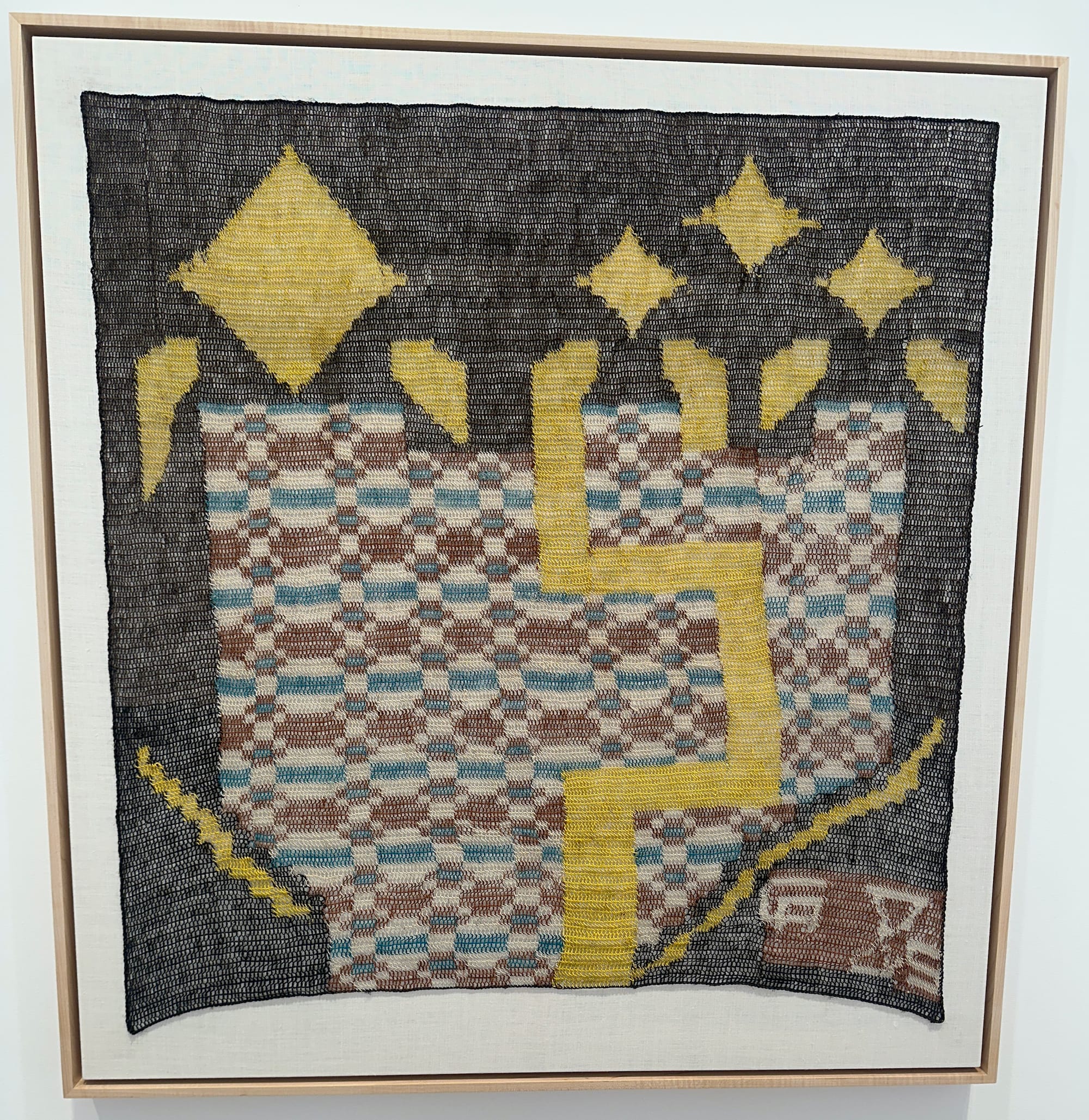 “Nosotras, hijas de las estrellas” (We, daughters of the stars) (2025) connects the present to the mythological Wichí origin story. Yellow shapes that resemble stars glow near the top. Below them is what might be the merest hint of a human figure, while gray sections woven into a whole are like the night assembled in pieces. Russet and off-white zigzags are pure, coursing energy and seem to oscillate and pulsate. This is one of several celestial-themed pieces in the show.