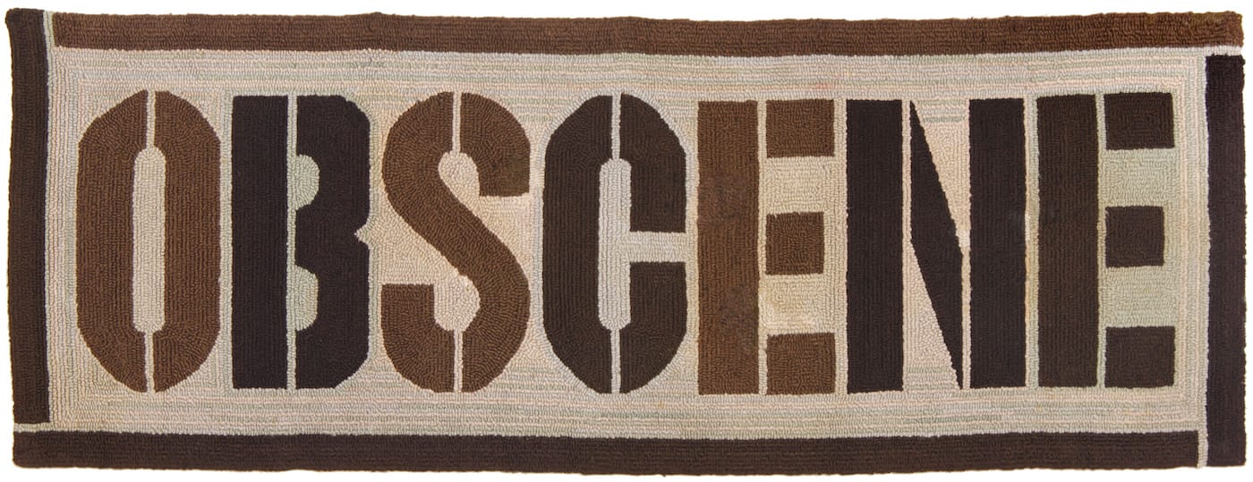 Another work, perhaps thought up in the back of a cab, depicts a taxi driver’s badge. It reads “Licensed Public Hack” — not a bad self-description for an aspiring Pop Artist. In another, a monumental payphone dial communicates a sense of panic, the numbers 440-1234 at its center being the city emergency line — the 1960s version of 911. And then there is a startling work that simply reads OBSCENE, in huge block letters. The word collides head-on with the stereotype of hooked rugs as a decorous medium — a contradiction that speaks with powerful concision to the changing cultural norms of the 1960s.