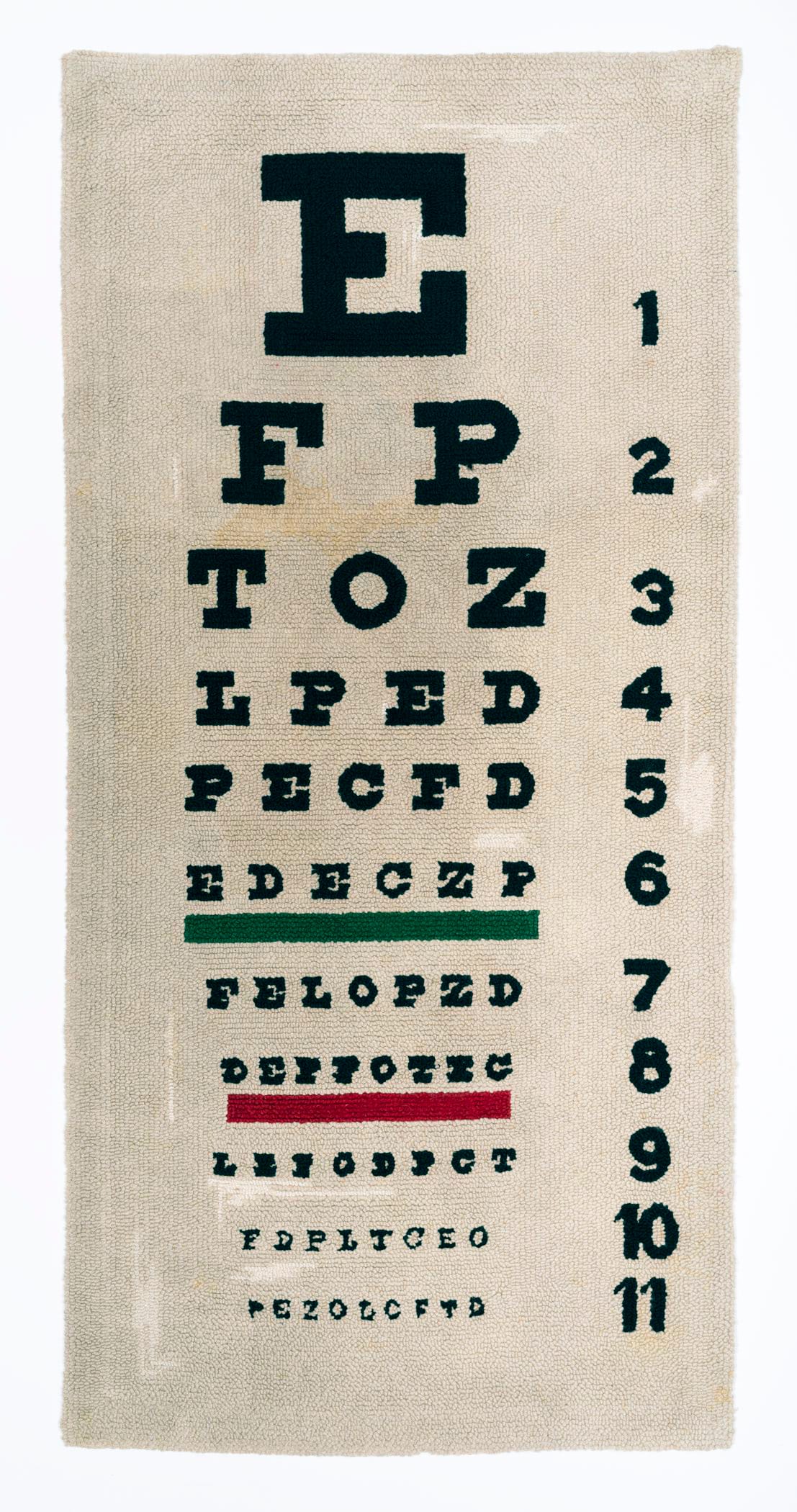 The art historian Michael Lobel also discovered an instance in which Grebenak crafted a rejoinder to Roy Lichtenstein, specifically a work depicting a man peering through a round porthole into a dark space: “I can see the whole room — and there’s nobody in it.” As was often his practice, Lichtenstein stripped down the source image, from the comic strip Steve Roper, rewriting the text slightly and removing the original artists’ signatures. In 1963, both the work and the source were reproduced in an article in Art News entitled “Pop Artists Or Copy Cats?,” written by an aggrieved illustrator whose work had also been appropriated by Lichtenstein. Grebenak was evidently attracted by this incident, for in 1964 she showed a rug work which reproduced the image again — not in Lichtenstein’s version, but just as it had appeared in Steve Roper, complete with the original signatures. It is difficult to read her intentions, but certainly it is possible that she wanted to indicate sympathy with the commercial artists whose work had been quoted; her show at Allan Stone (which she shared with the artist John Fischer) was pointedly entitled Odd Man In. It is also intriguing that the image — in all three versions — takes the act of looking as its central theme. This was a persistent concern of Lichtenstein’s, and evidently also of Grebenak’s, as we can conclude from another 1964 work, “Eye Chart.” Though Allan Stone kept the rug work on the floor — it has numerous repairs today — it is best seen on a wall, hung at optician-office height, an object that explicitly acknowledges your own gaze.