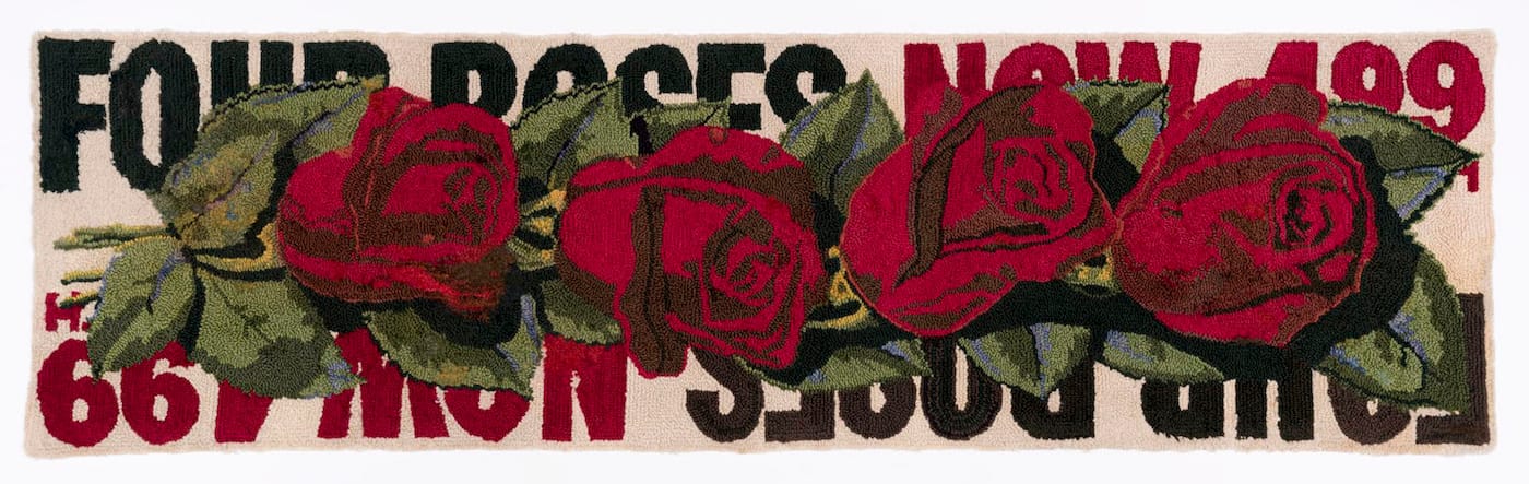 Grebenak’s iconography was similarly unassuming — classic deadpan Pop — but was unusual in that it was drawn from public spaces. She reworked New York’s streets with her needle punch, both literally and figuratively. Her most common motifs were manhole covers, based on charcoal rubbings, a series she had begun by 1963. Grebenak also had a keen eye for signage. “Four Roses,” circa 1964, has nothing to do with the whisky brand of that name; it seems to have been grabbed from a florist’s sidewalk display. The serial, flip-flopping lettering comes across as concrete poetry, and juxtaposed with the floral motif, prompts thoughts of Gertrude Stein.
