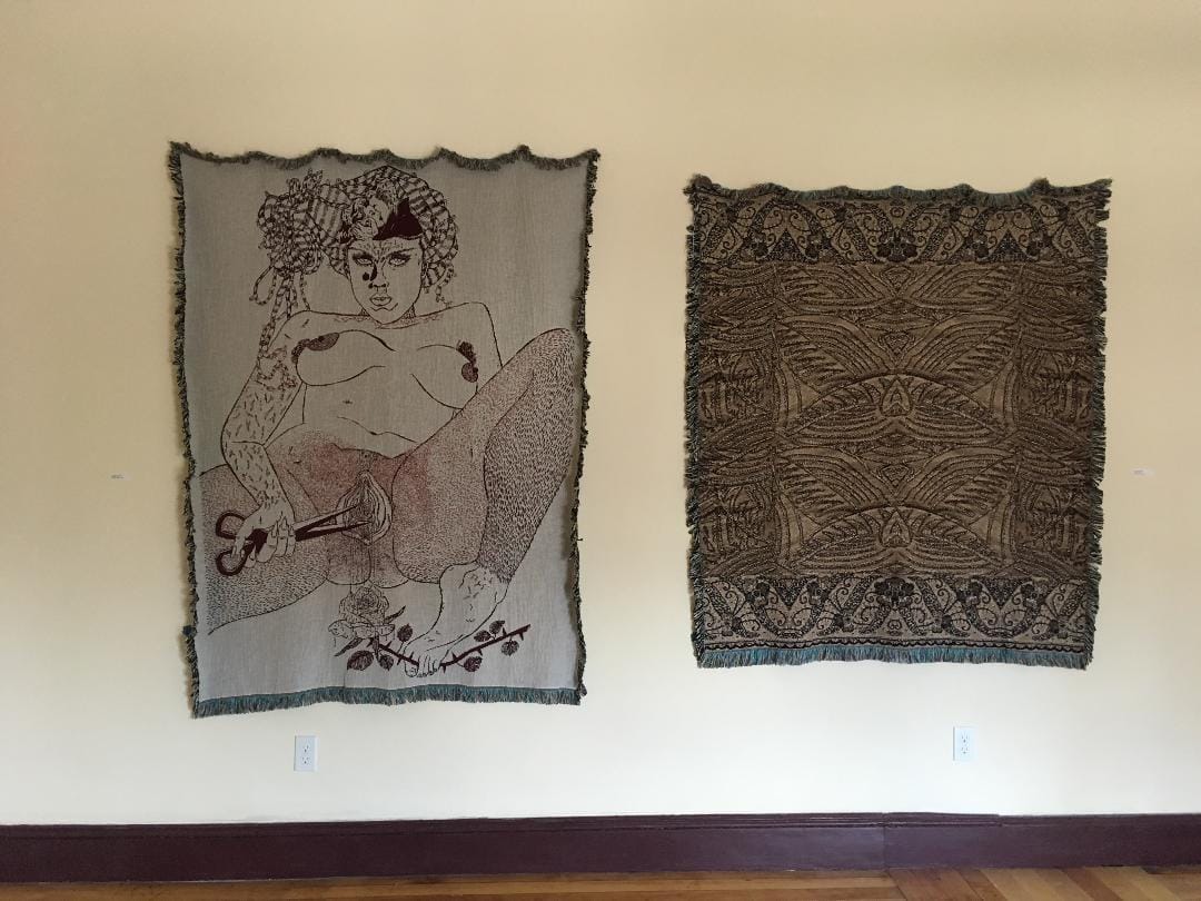 Art deco wallpaper, designed and installed by Alison Nitkiewicz, is one of the first works you see upon entering the house. It lines the walls of the entryway and leads up the central staircase to the second floor. Nitkiewicz’s geometric design was inspired by beadwork in the Tirocchi sisters archive (housed at the RISD Museum); she printed it using a CMYK process. Paired above a Liz Collins–designed carpet, made up of dark blues and reds, the effect is dizzying and exhilarating. The maximalist approach sometimes borders on visual overload — but it also made me excited to see what else this mansion had to offer.