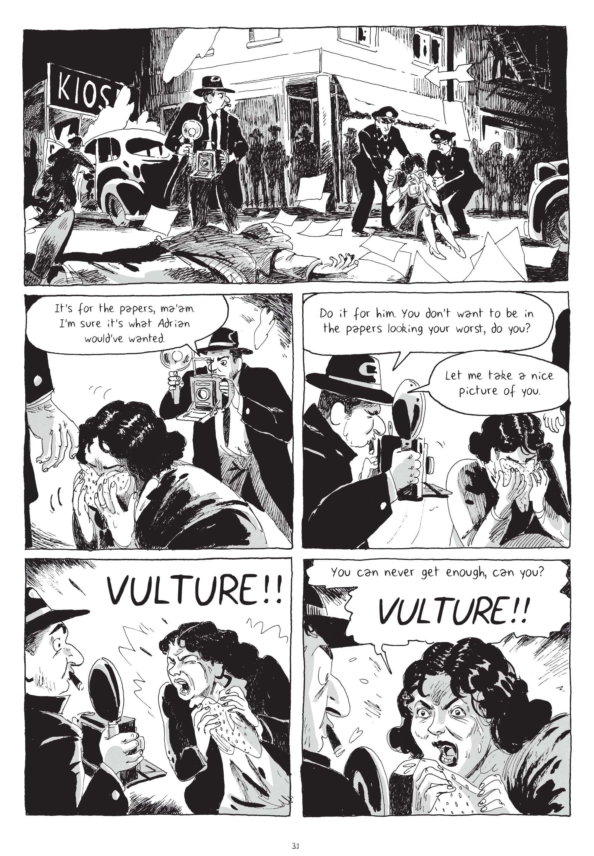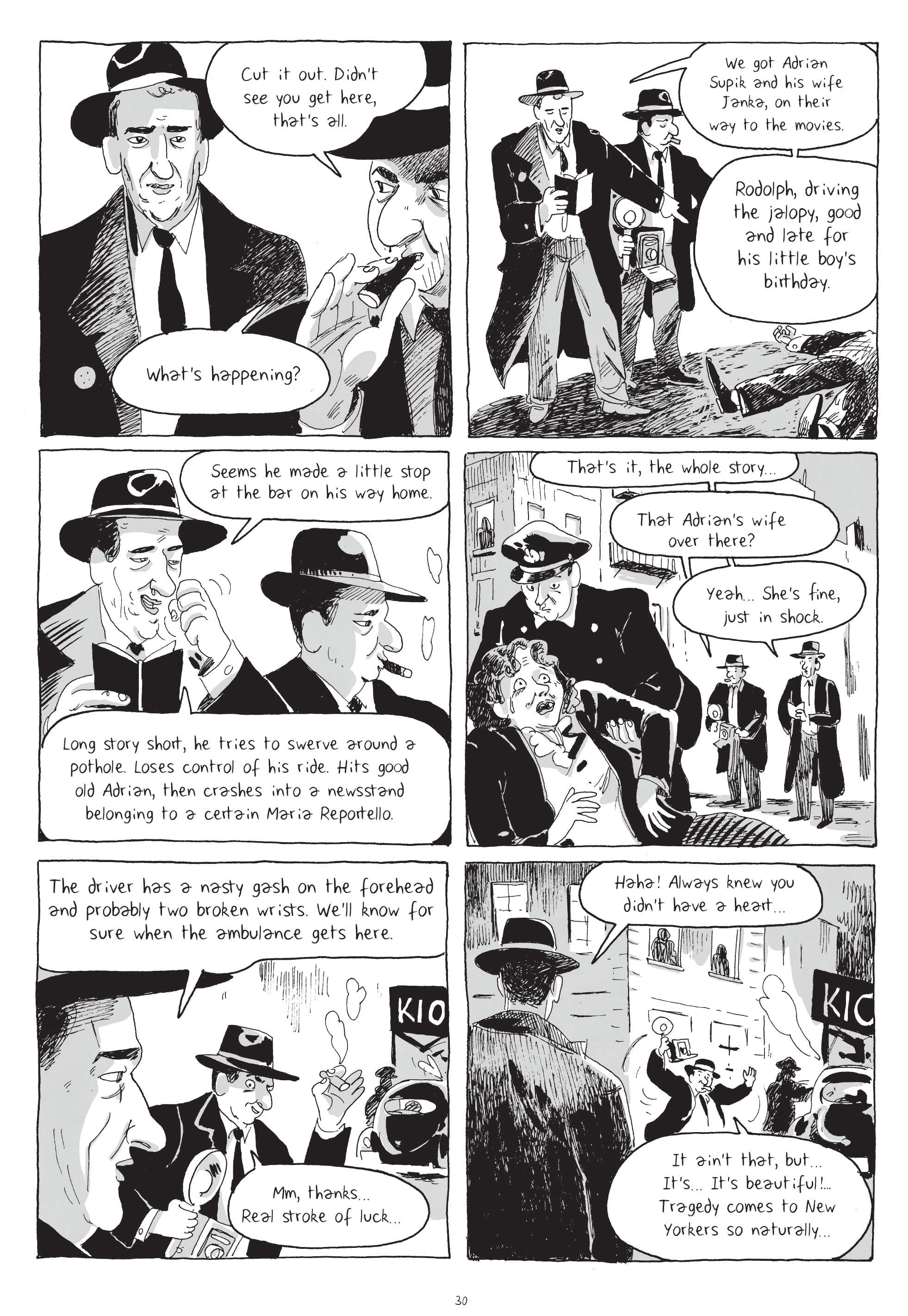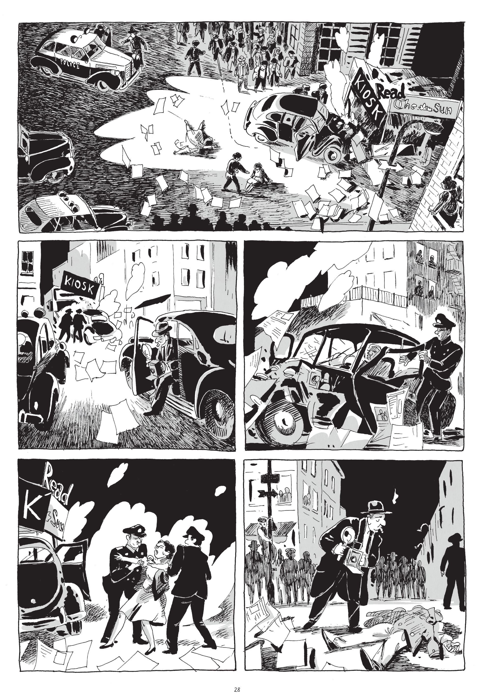 As the book opens, we see Weegee lug his Speed Graphic camera through a crowd gathered around a corpse at Midtown’s Tudor Cinema. Mannaert — whose characters’ spirited expressions and careful renderings of tenement facades are indebted to Will Eisner’s — washes the sequence in inky shadows worthy of the era’s gangster films. He blackens the space under his photographer’s hat, save for an exaggerated nose and receding chin. De Radiguès’s script, meanwhile, is reminiscent of the curt captions in Weegee’s 1945 monograph Naked City, where a shot from this incident appears. “Poor chump, wasn’t his night,” Weegee mutters of the body. Mannaert’s sinister composition proves apt: Before the cops arrive, Weegee repositions the corpse to heighten the drama. Then he snaps his photo.