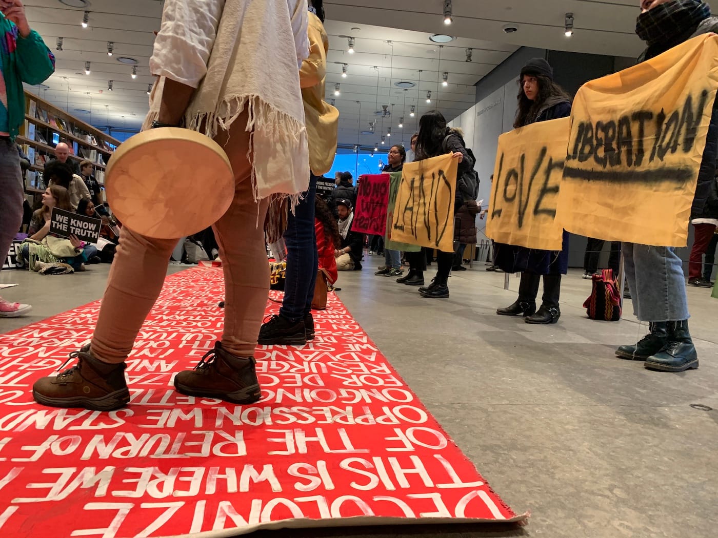 “This is about sharing with all our ancestors. This is about love, and this is about land, and this is about liberation,” she announced to the demonstrators, gathering crowd of tourists, and museum staff, “Today, there is no more shame. Bring that love out and sing with us.”