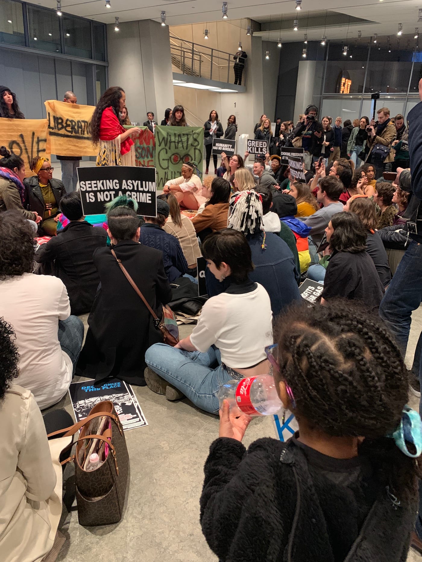 The second in a scheduled “Nine Weeks of Art and Action” organized by the movement Decolonize This Place began with a huddle of singers and a sonorous chant. Activists gathered to discuss their upcoming demonstration; they began disseminating their flyers to museumgoers and discussing strategy. Posters were also passed around, some of which read “seeking asylum is not a crime” and “choking freedom at the Whitney.”