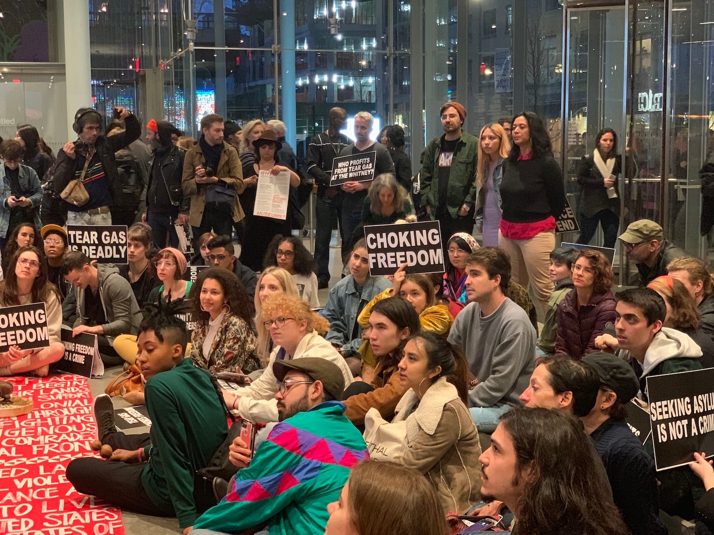 Protesters were in the Whitney Museum’s lobby to demand the removal of one of the cultural institution’s vice chairmen, Warren Kanders. A November report by Hyperallergic identified Kanders as supplying the Trump administration with tear gas canisters and smoke grenades through his multi-billion dollar weapons manufacturing company, Safariland. The company’s anti-riot ballistics have appeared in political clashes around the world from Standing Rock to Baltimore, Ferguson, and Gaza. They also announced a $7.3 million sale of ballistic equipment to the NYPD in 2016. More recently, Safariland canisters were found at the US–Mexico border after American patrolmen launched them at Central American asylum-seekers.