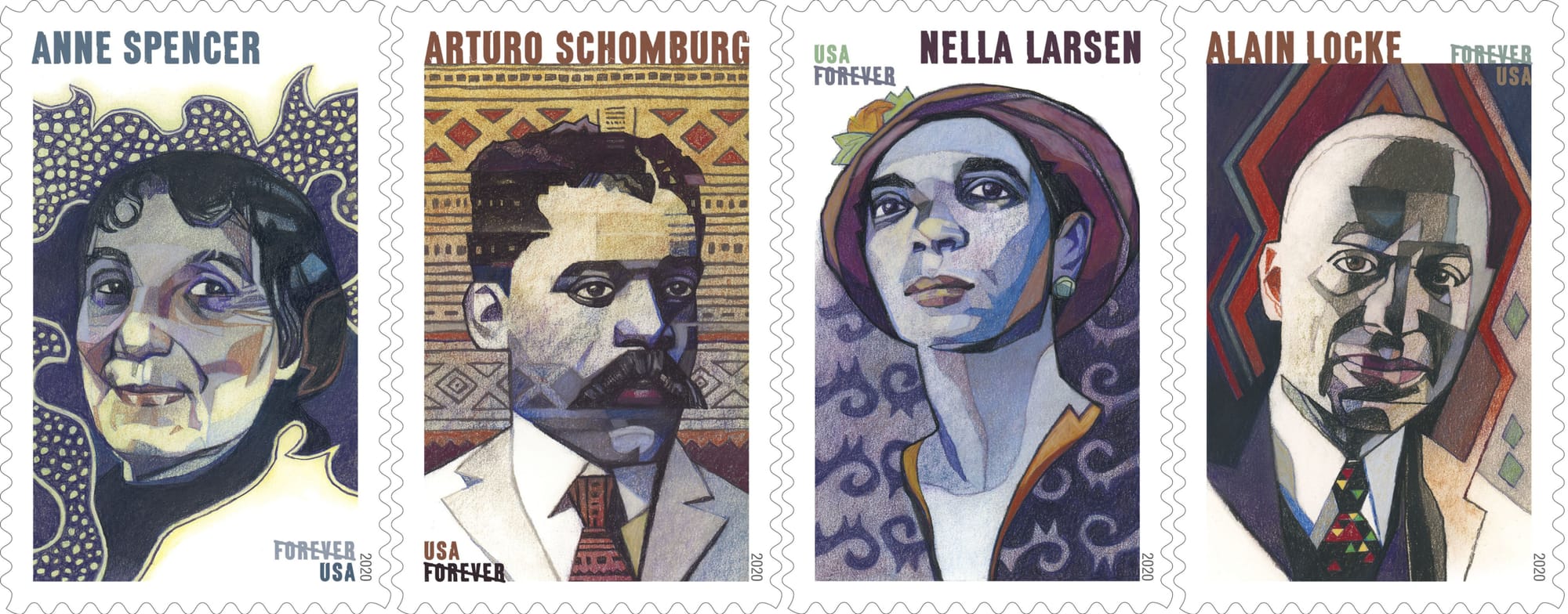 A new set of USPS stamps commemorates four Harlem Renaissance figures: novelist Nella Larsen, philosopher Alaine Locke, historian Arturo Alfonso Schomburg, and poet Anne Spencer.