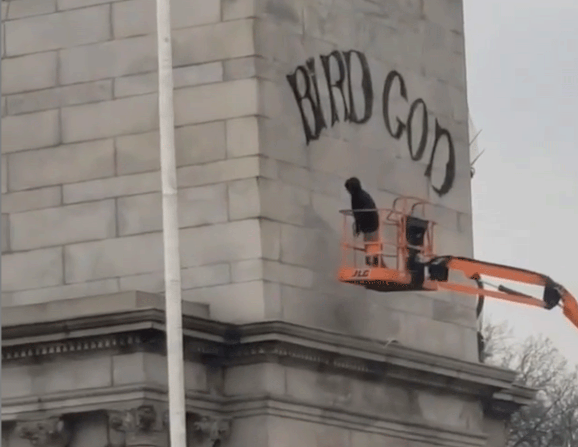 A man in Brooklyn hijacked a crane and sprayed the graffiti “Bird God” on the arch of Grand Army Plaza. He was apprehended shortly after. In court, the tagger claimed that he was instructed to paint the cryptic message in a 1960 letter from his great-great-grandfather. It gets even more bizarre. Click here for the full story.