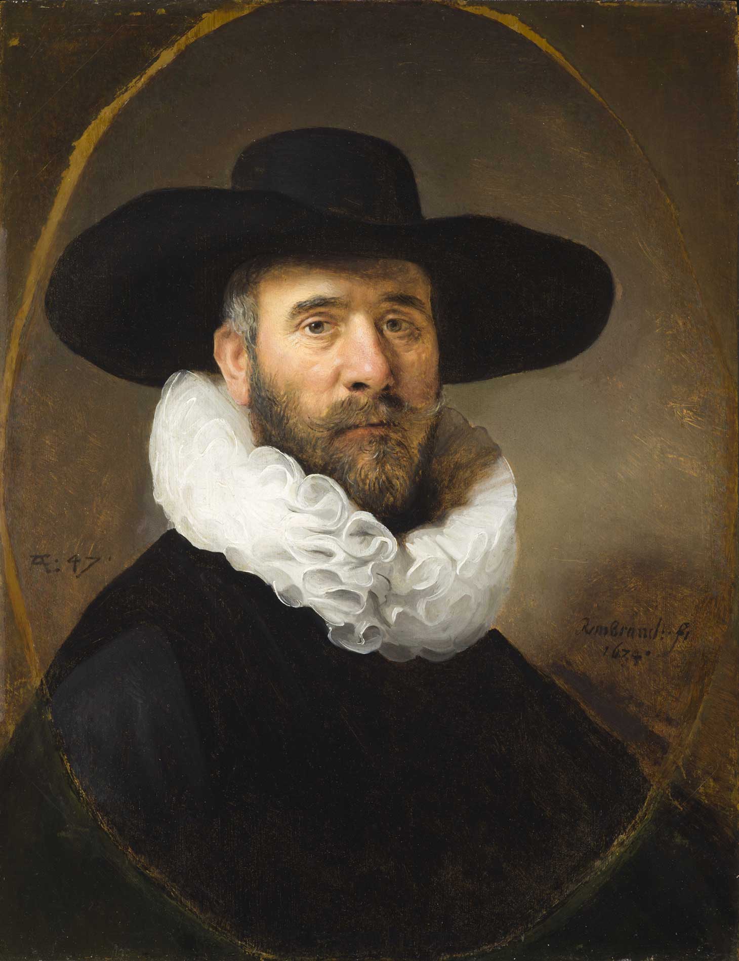 Rembrandt Harmensz. van Rijn, “Portrait of Dirck Jansz. Pesser” (ca. 1634), oil on wood, oval: 25 1/2 × 19 7/8 inches, enlarged to rectangle: 27 1/8 × 20 7/8 inches, frame: 42 × 35 1/2 × 3 inches, Frances and Armand Hammer Purchase Fund (image courtesy LACMA)