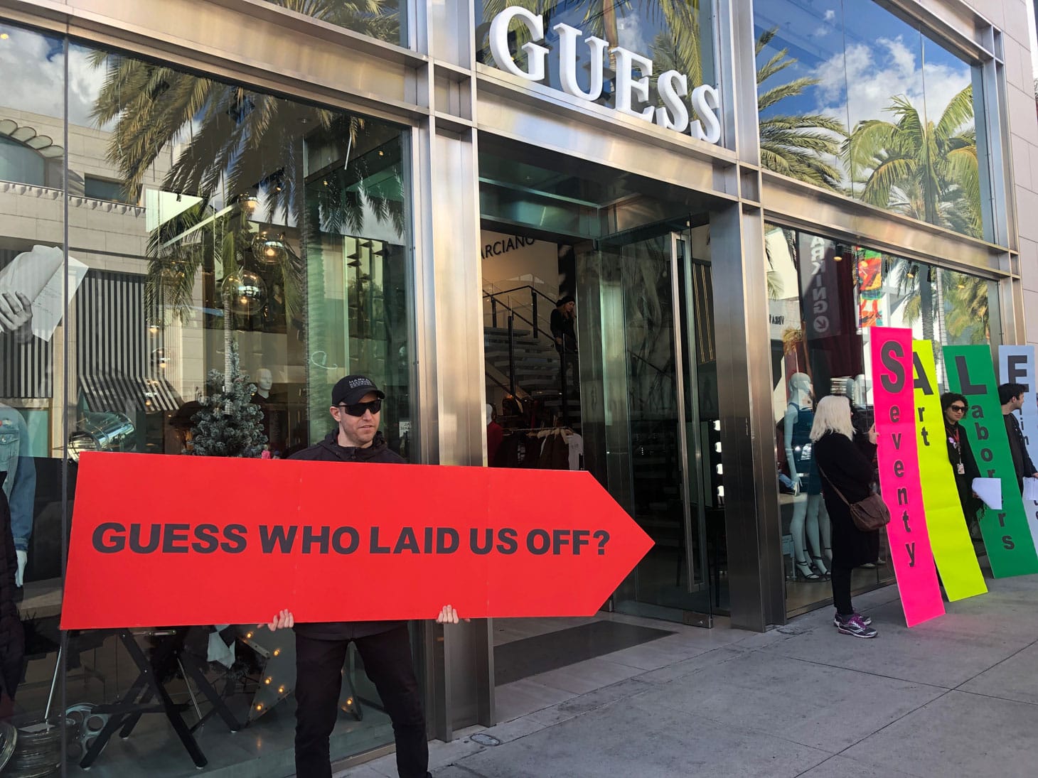 In their ongoing struggle for the recognition of their union and reinstatement of their jobs, members of the Marciano Art Foundation (MAF) Union, along with supporters around the country, demonstrated in front of Guess stores on the busiest shopping day of the year, Black Friday. The Marciano brothers, Paul and Maurice, co-founded Guess clothing brand in 1981.