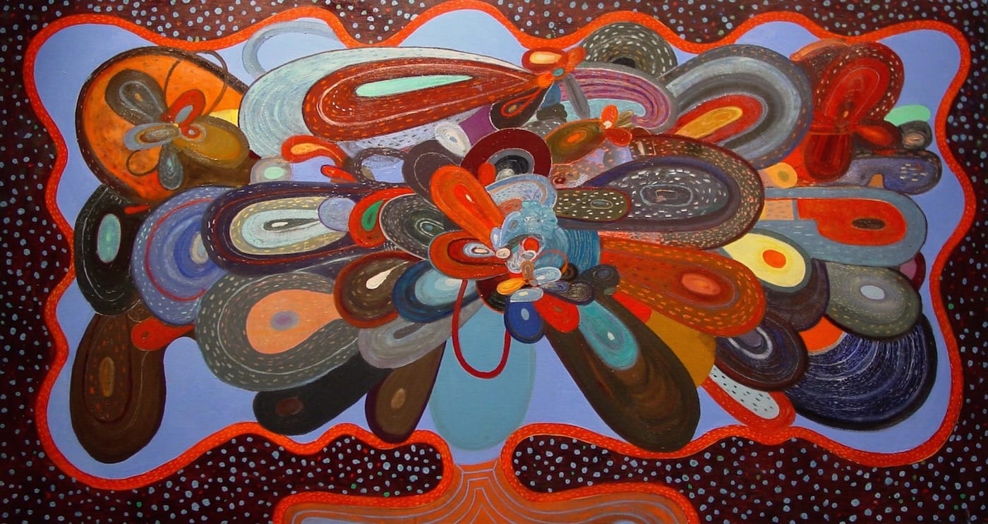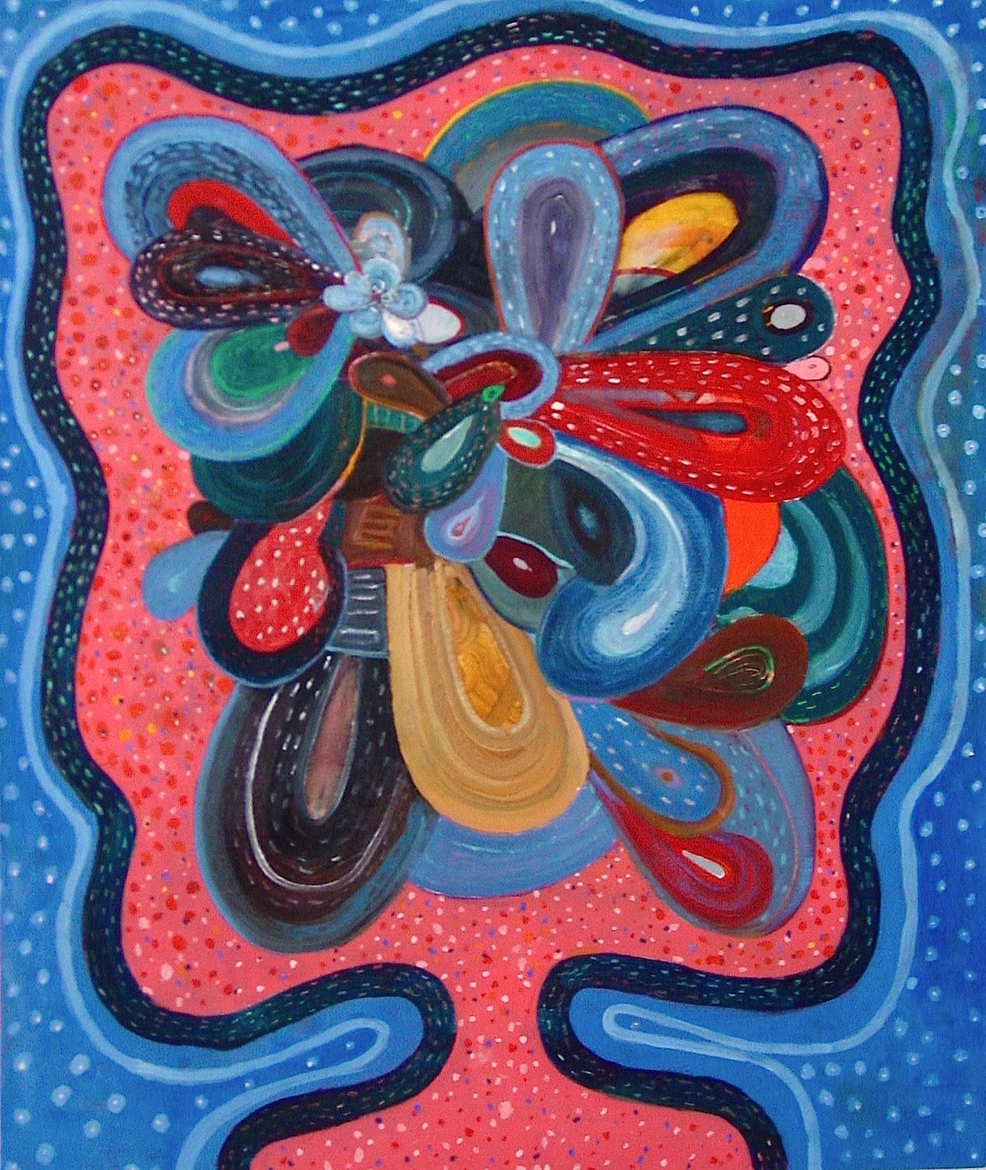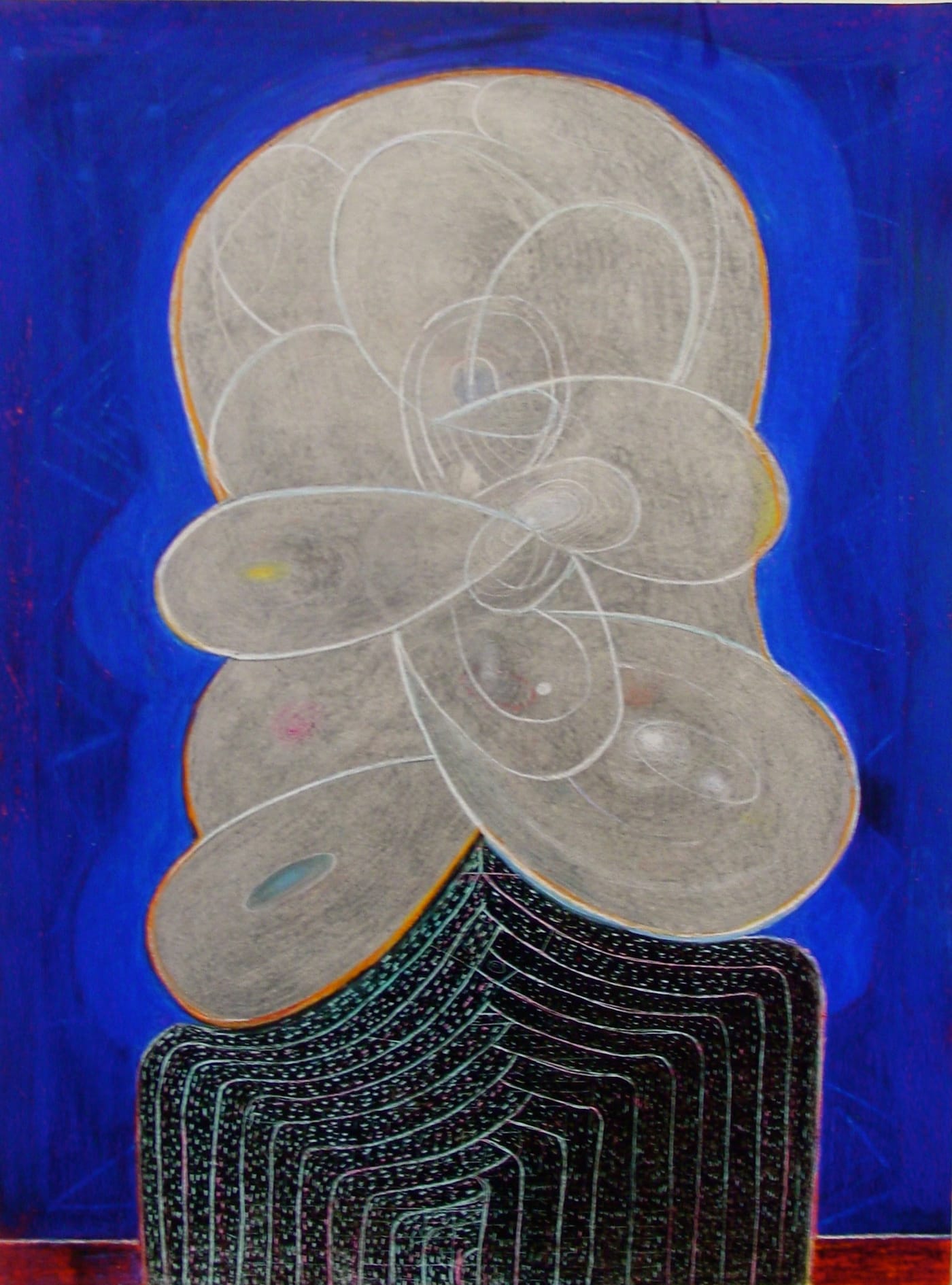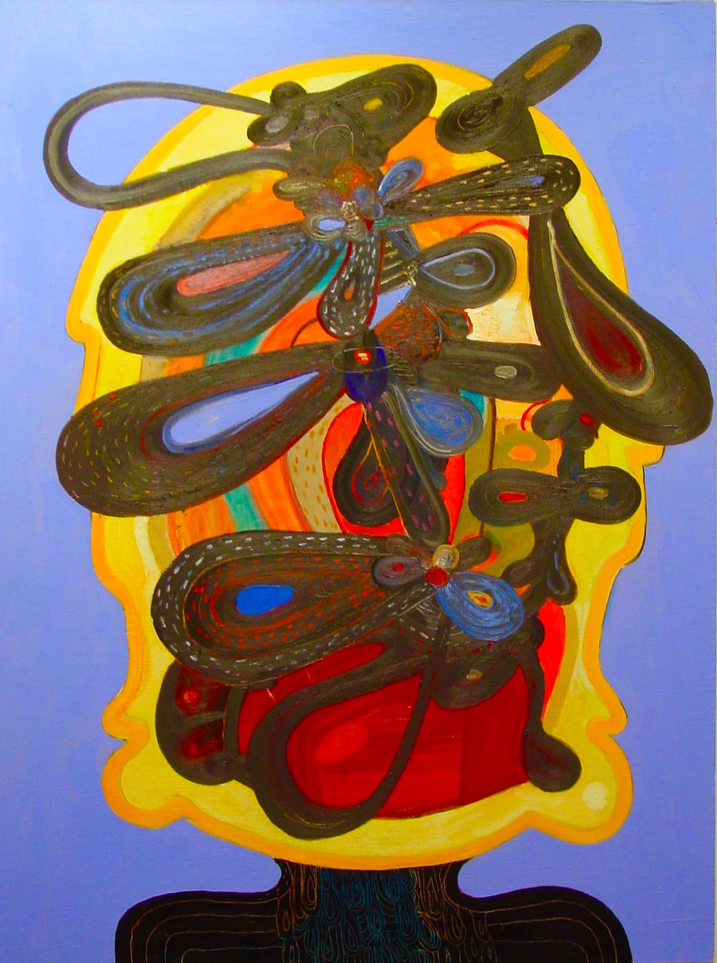 The idea for the heads came from a game of exquisite corpse that Hull played with two friends, the saxophonist and composer Ken Vandermark and the illustrator and printmaker Dan Grzeca. Hull drew a horse’s rump with a looping tail, which became a profusion of petal-like shapes activated by concentric lines and dashes. He carried this profusion of shapes into his paintings, where a cell-like structure, complete with nucleus, can be found in many of the petals. The cells can look like eyes, all of which seem to be staring at you blankly. Other times the petals resemble the tongues of panting dogs, whirlpools of paint, a multitude of large ears, the leather plates and scales of samurai armor, or parts of unidentifiable and possibly dangerous plants. This dense bouquet of colored shapes is balanced on top of a neck and shoulders (or is it the top of a jug?) rising up from the painting’s bottom edge.