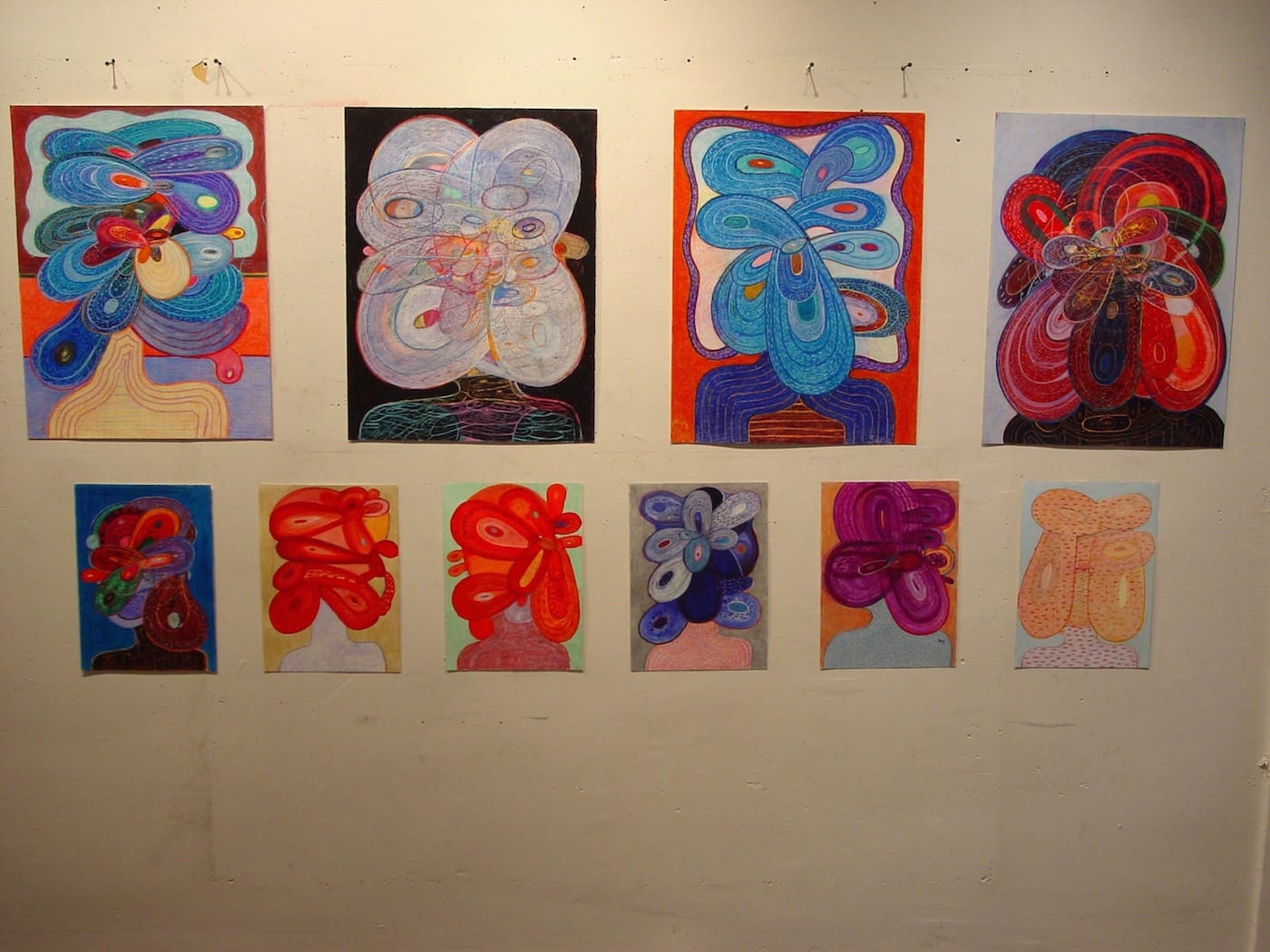 At some point, I asked to see some drawings. I was curious because, during our conversation, he mentioned that he drew with Crayolas when he was a kid growing up in Oklahoma City. He began using them again when he moved to Chicago to get his MFA at SAIC, and hasn’t tired of them. It’s not hard to see why. Originally there were eight colors in a box of Crayola Crayons. Now you can get such colors as “Alien Armpit” (yellow green), “Atomic Tangerine,” “Neon Carrot,” and “Blizzard Blue.” I would not be surprised if Hull has used nearly all of them. It would be interesting to learn the names of all the reds, browns, and blues he uses in a single drawing.