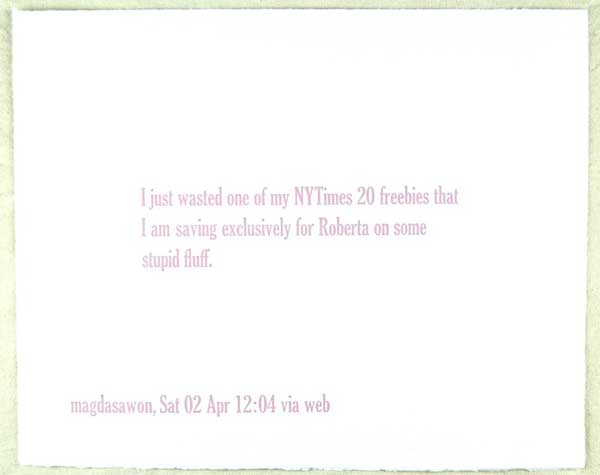 Twitter fanatics, listen up. Dumbo Art Center presents the opening of artist Michelle Vaughan’s show “100 Tweets,” an exhibition with “just a few offerings for those who nerd-out on type, letterpress, Twitter, snark and perhaps appreciate the art of a nicely written tweet,” as the press release states. Vaughan scoured her Twitter feed for 100 comments, some personal and witty, others mundane and boring, that she then documented using a hand typeset letterpress. Riffing off of Gerhard Richter’s random selection of colors for his grid paintings, Vaughan used the website random.org to generate colors for “100 Tweets” so no two prints are alike. Through the use of a letterpress, Vaughan’s gesture is almost a comical one as she transforms the split second immediacy of Tweeting into a laborious, manual process.