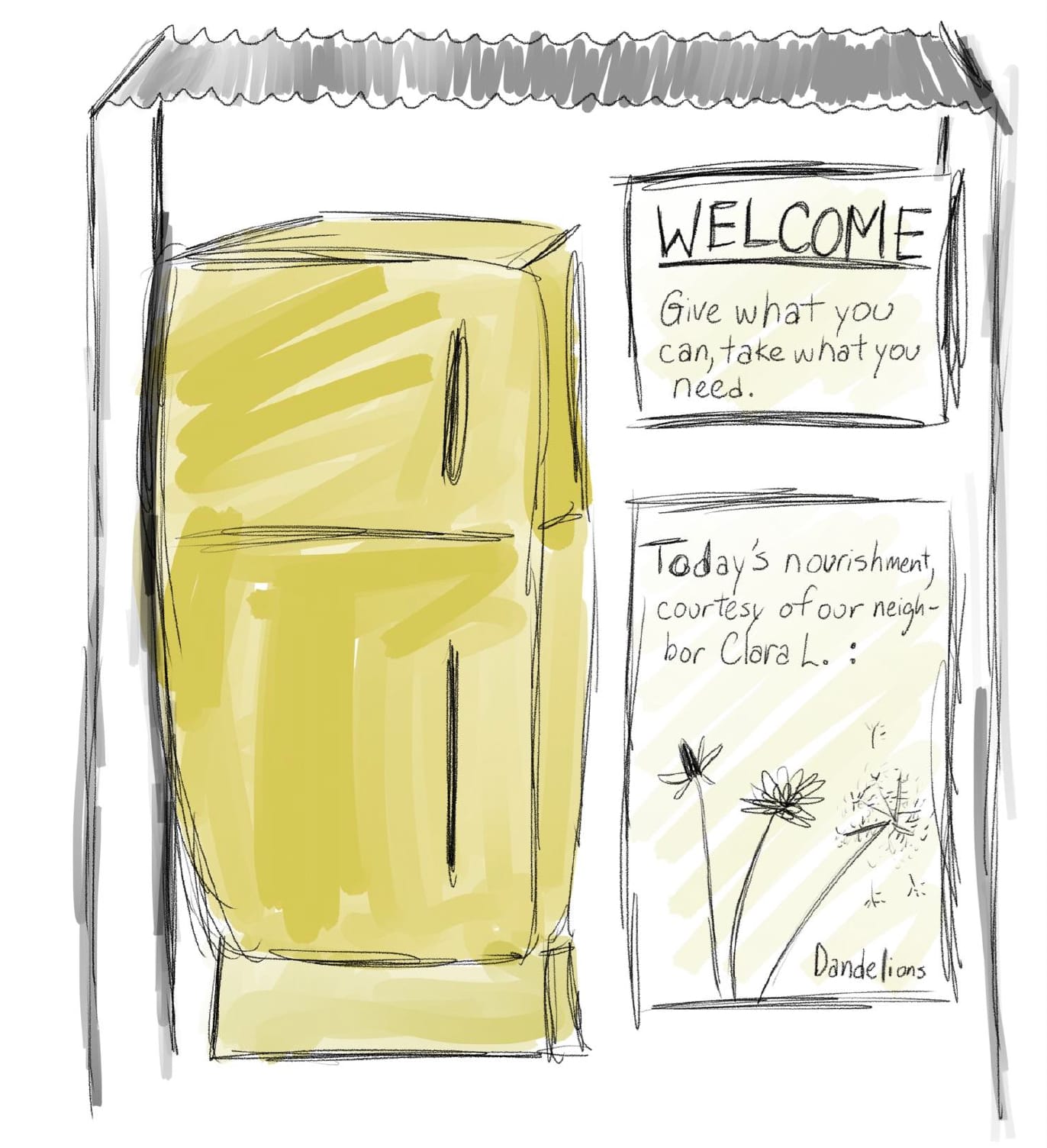 If you’re in a city, you might pass one of the infinite iterations of the “The Museum of Intergenerational Nourishment” on a street corner. Sited inside a humming yellow-green community refrigerator, this museum makes its function explicit: to preserve the freshness and usability of the items inside, a direct challenge to our contemporary museums which expect to keep things well past their “use by” date. The form of this museum, with its familiar and easy to operate handle, invites anyone to open the door, as does the cheery sign: “Give what you can, take what you need,” because who’s afraid of a refrigerator? (Relax, regular cleaning procedures are in place to make sure there’s nothing sketchy in here.)