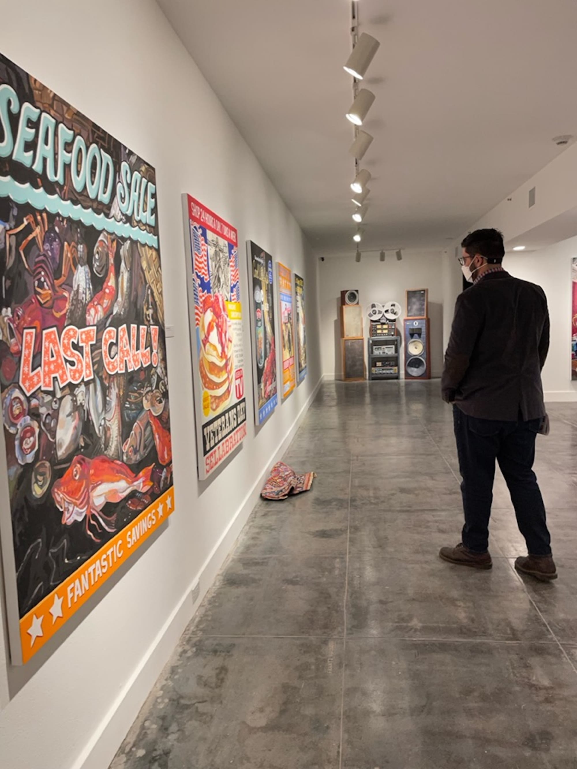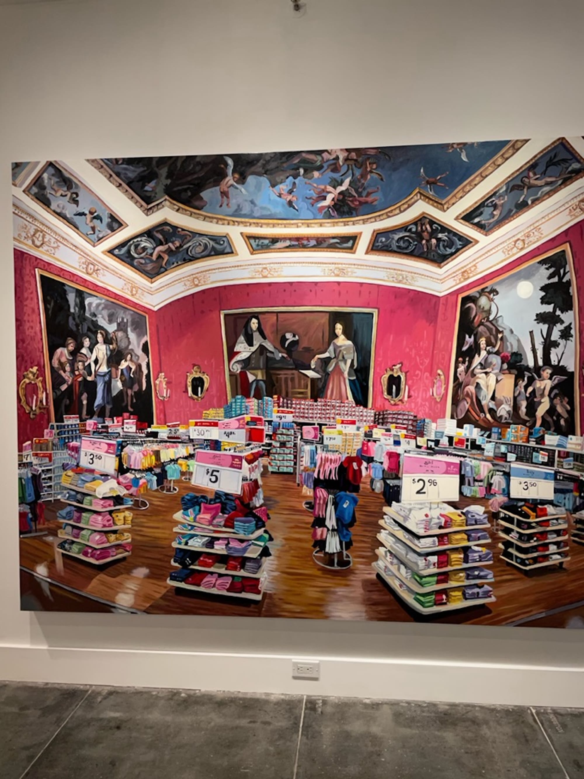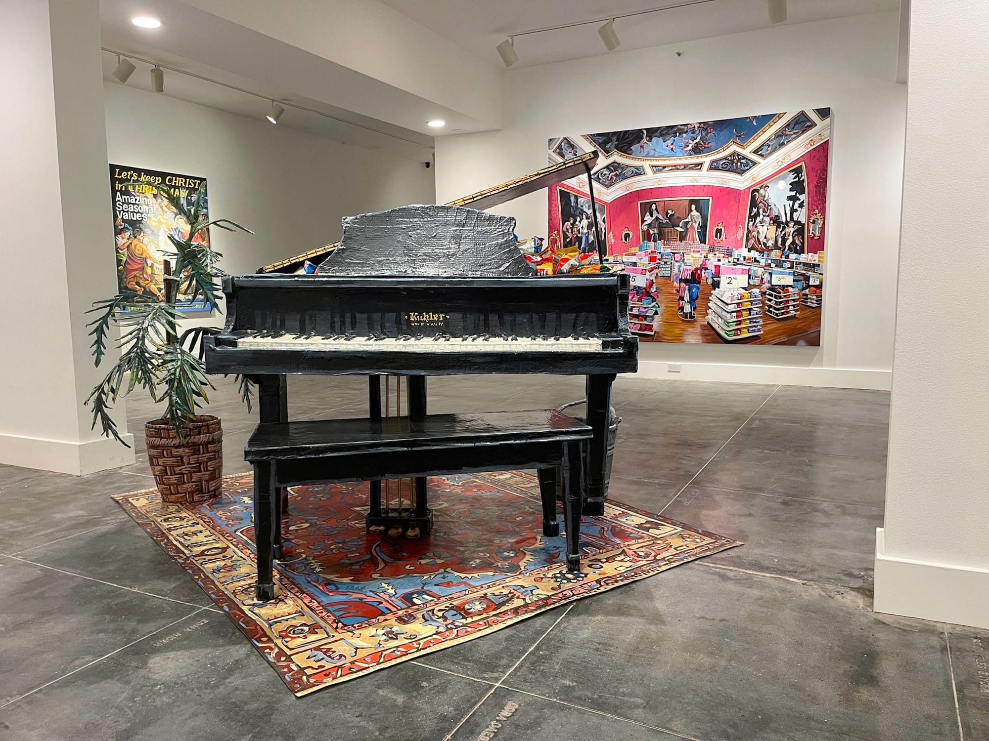 Like “Discount Barn,” the installation “Baby Grand” (2006) points to the “absurdity of art’s social signifying and detachment from the everyday,” Lowe explained to me. Here, she has fabricated a cloth-mâché piano that sits atop a replica Persian carpet, flanked on one side by a potted houseplant. In addition to its function as a signifier of bourgeois cultural aspiration, Lowe’s piano is also a working cooler — packed with chips and soda to be taken and enjoyed by gallery-goers at their leisure. This intentional destabilization of the high-low binary is reiterated in the paintings that surround “Baby Grand.” One large example, “Boy Girl” (2018) from the series Love for Sale, reimagines the interior of a big box store within the opulently adorned 18th-century antechamber of the Nymphenburg Palace in Munich. On a nearby wall, the five-painting series Last Call! (2017-2018) borrows the structure of unsolicited mailers, which advertise everything from discounted medical procedures to blow-out produce sales (they are already so absurd, said Lowe, that they were difficult to satirize). By incorporating the visual language of Dutch Golden Age still-life paintings into an ad for canned lobster, or appeals to patriotism to sell pancake subscriptions, Lowe elucidates the many ways that our value systems are often manipulated to capitalist ends.