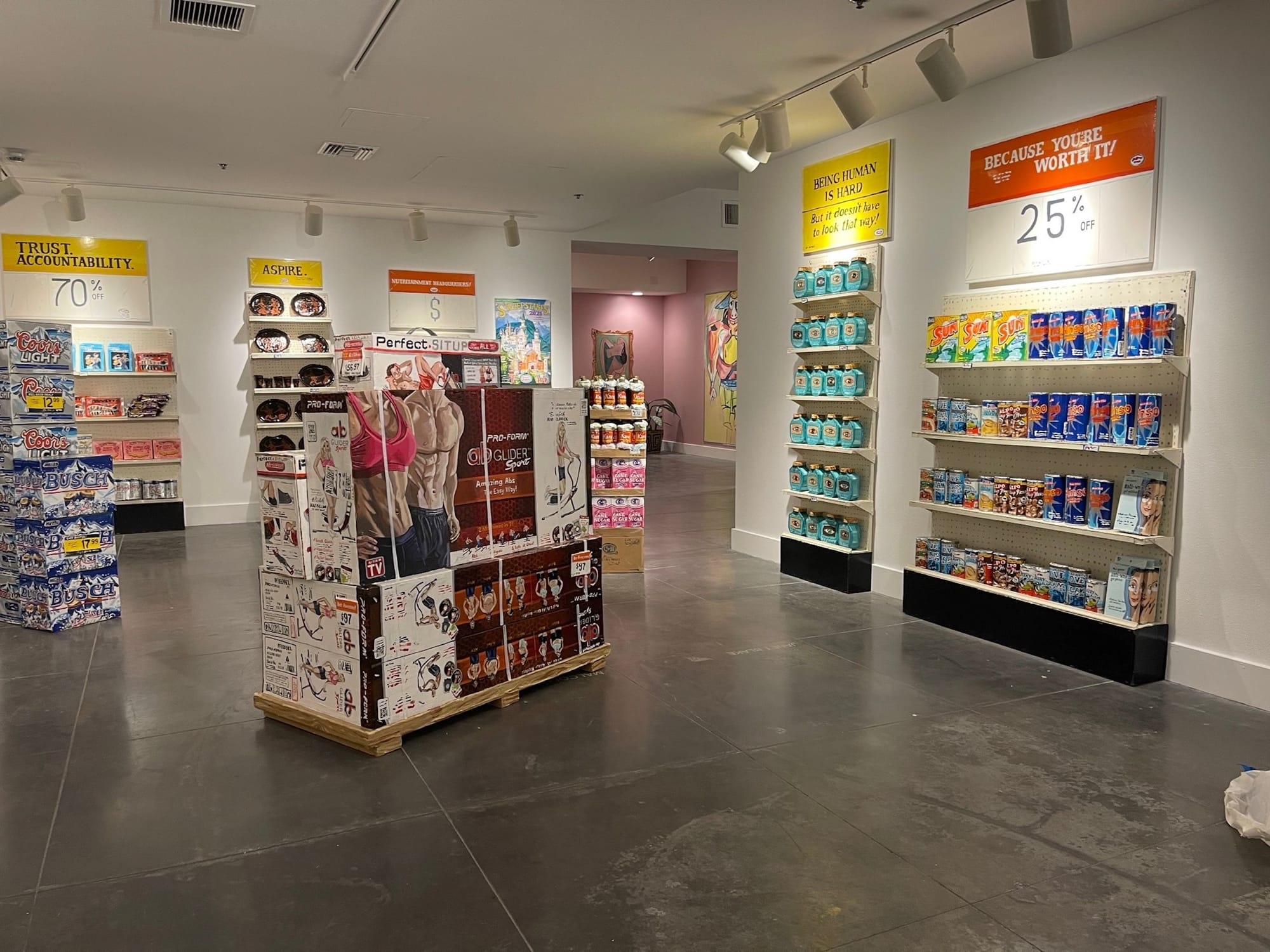 Browsing the shelves of the "Discount Barn” serves as the introductory act to the performative experience of Lowe’s Multiverse. Moving through the exhibition is not unlike walking onto a set; in Lowe’s Multiverse, we are both actor and audience, parodying our most banal behaviors by consuming images of our own consumption. For more than 35 years, Lowe has combined her acerbic wit with sumptuous visuals to create images, objects, and environments that simultaneously indict and delight. She blends the languages of consumerism and cultural cachet to shed light on humanity's relentless desire to acquire, achieve, and improve — at all costs.