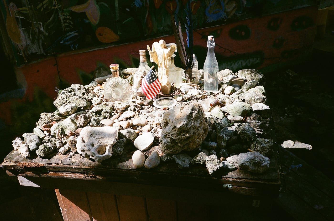 The flora surrounding the Well of Mysteries partly obscures it from the street. Nothing else looks quite like it, an anachronistic, fairy-tale gingerbread cottage in the city’s financial center, surrounded by tall pines and lush mango trees. I visited in February, when filmmaker Dara Friedman invited locals to attend a blessing ceremony on the property after a screening of her 2014 film, Ishmael and the Well of Ancient Mysteries, at the Pérez Art Museum Miami (PAMM). In the film, Bermudez discusses his five-decade excavation and the strange magic of his home. (The screening and subsequent visit ran concurrent Friedman’s exhibition Perfect Stranger.) The ritual itself was short — Friedman blew into a seashell four times, facing a different direction with each vibration, in honor of the north, south, west, and east.