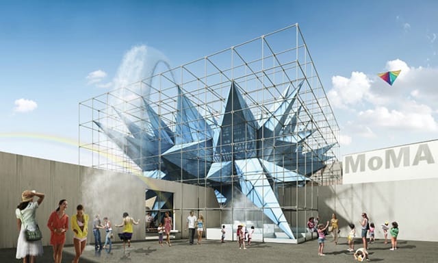 The 2012 selection of MoMA PS1’s Young Architects Program, Wendy is a mammoth sacrificial eco-sculpture who will suck up environmental pollutants from Long Island City’s atmosphere. She was designed by NY-based architects, Matthias Hollwich and Marc Kushner, principles in the firm HWKN. Blue-skinned Wendy is covered in nanoparticles. Her nylon skin works like flypaper to capture pollutants in the air. (Though I can’t evaluate the science behind Wendy, MoMA PS1 claims, “Wendy will clean the air to an equivalent of taking 260 cars off the road.”) By all measures, the work is formally and socially engaging. She gathers visitors together, unites several parts of the PS1 complex, and offers a striking, multi-storied view from PS1’s gallery windows. And, Wendy is super-cute.