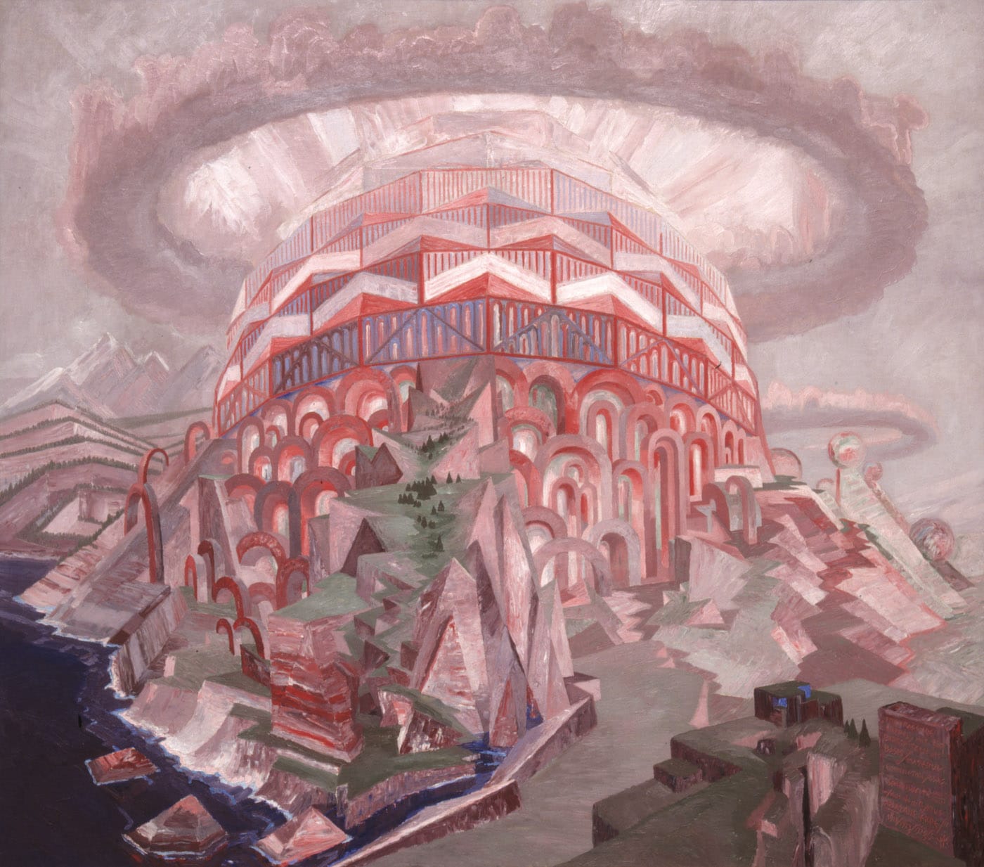 Hablik completely turned his attention to contemporary architecture by the late 1910s, specifically studying the crystal structures that had been erected all over Europe in the mid- to late-1800s. (Think about London’s now-destroyed Crystal Palace in Hyde Park or Madrid’s still-existing Palacio de Cristal.) His tessellated colosseums are borderline biblical in appearance, splitting the difference between an ancient volcano and a stairway to heaven. Arguably his greatest painting, “Self-supporting dome with five mountain peaks as base” (1918/23/24), depicts a pink megalith marked by grand arches and an angelic halo. While beautiful, there are more telling elements of design in the landscape’s mountains and shore. Here, we see that Hablik has abandoned the smooth, naturalistic forms of his earlier paintings in favor of hard, rectilinear lines.