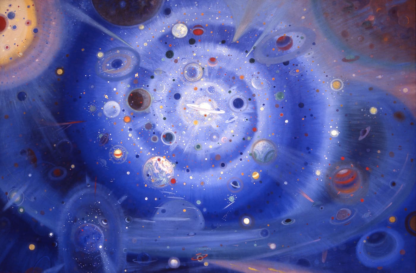 A consummate traveler, Hablik’s frequent journeys across the globe — to South America, the Ottoman Empire, and throughout Europe — opened his eyes to new aesthetics and forms. His trips to Italy, Greece, and Constantinople were especially important, exposing the artist to the squat, hexagonal geometries of old Christian and Eastern Orthodox churches. Synthesizing these ancient forms with his previous fairy tale castle drawings, Hablik’s work became more ambitious and fantastical. He overwhelmed his beloved landscapes and skies with schematic machinery, advanced (if highly unrealistic) air colonies. At a critical moment, Hablik transposed the ideals of German Romanticism to proto-Space Age fetishism for a utopian, technological society. Suddenly, we see the artist explode his style into the cosmos. “Firmament” (1913) zooms through the universe at hyperspeed, combining known and fictitious planets together into a whirlwind of space.