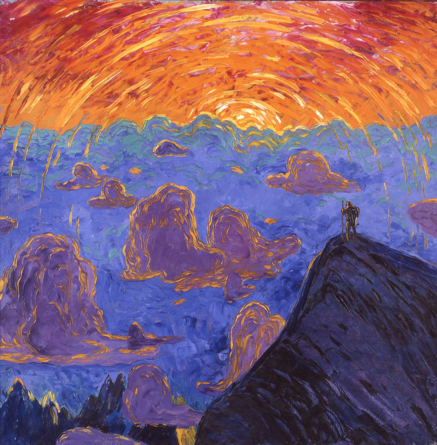 At the outset of his professional career, Hablik experimented with different color palettes while holding true to an Impressionist style championed by the Berlin Secessionist movement. “The Innkeeper of Schlossberg,” a 1906 portrait completed near the artist’s hometown of Brüx, Bohemia (present-day Most, Czech Republic) is a swirly mishmash of browns and greens. But the innkeeper’s face is an exceptional site of color clashes, mixing bright oranges with teal and yellow. Completed that same year, “Sunset Mont Blanc” spreads those three colors across the canvas while adding deeper blues, purples, and reds. Here, we get a real sense of Hablik’s main passion: the great outdoors. With the sun baking the sky, a single hiker overlooks the blue mountaintops below, purple clouds filling the stratosphere. Compositionally, “Sunset Mont Blanc” owes much to Caspar David Friedrich’s Romantic 1818 masterpiece, “Wanderer above the Sea of Fog.” But Hablik combines the setting with an impasto brushstroke à la Vincent van Gogh.