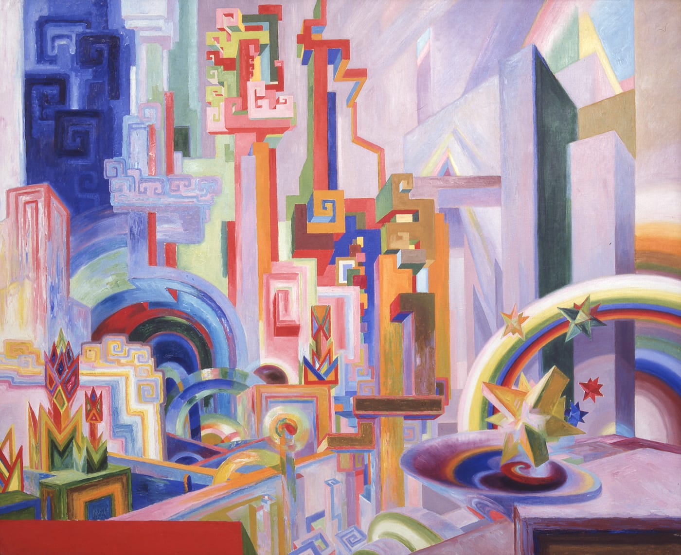 In his later years, his utopianism turned to décor, transforming the dining room of his home in Itzehoe, Germany into a mural of interlaced rainbow blocks of color. (Serendipitously, Hablik saved his chromatic dining room from the Nazis when he decided to renovate it with neutral wallpaper. The murals were only discovered in 2013 by chance.) Finally, we see Hablik fully indulge in the gestalt of aesthetic optimism. Art has the ability to overwhelm the viewer and transport them to a future better than their present. Hablik desired such a future, one where art could intervene in people’s lives and lift them up into utopia.