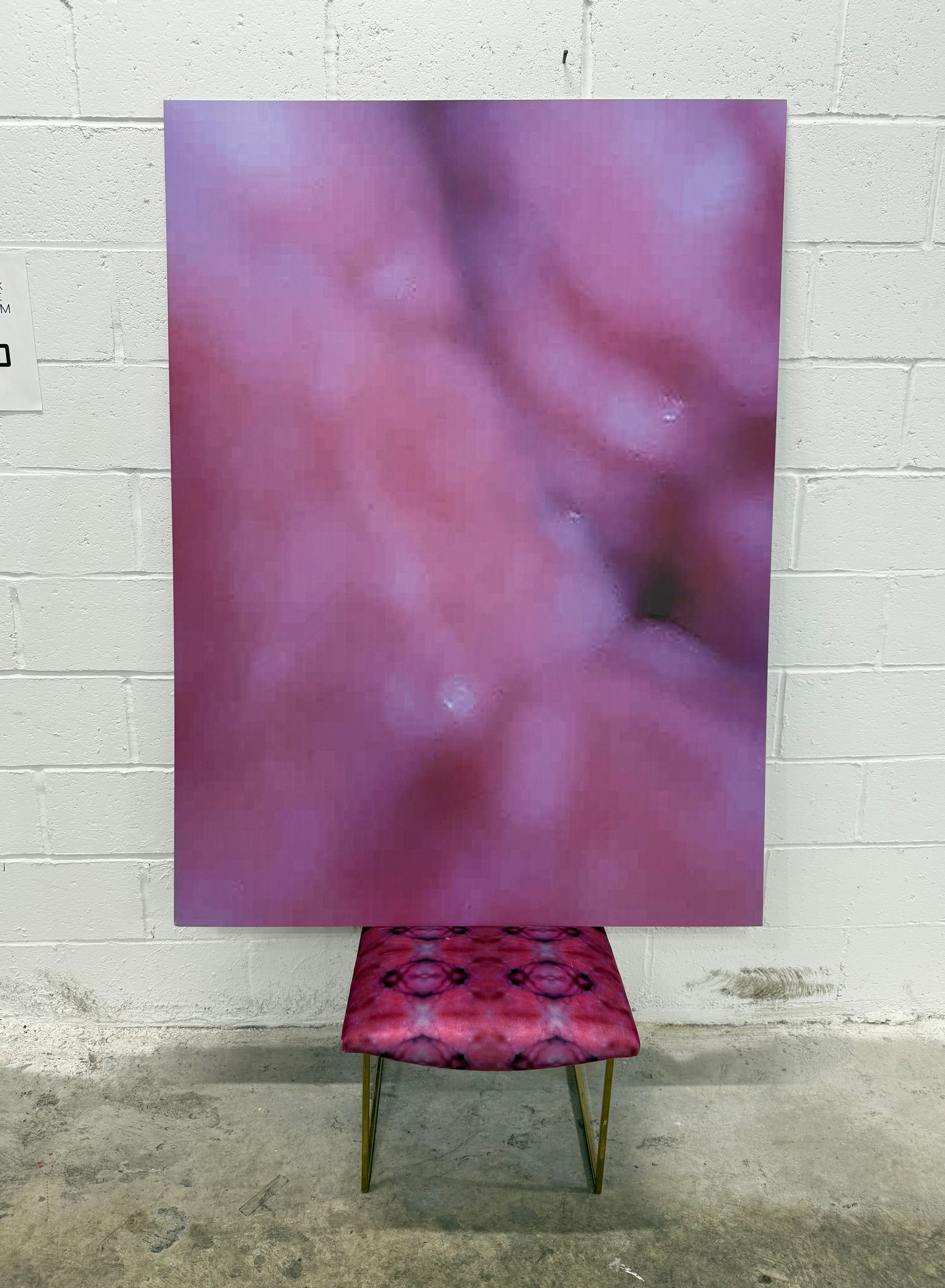 There, Christen Clifford’s “Interior Portrait: Tunnel 28” (2021), a more than four-by-five-foot (~1.2 x 1.5 m) dye sublimation print of what looks like the inside of a rectum, set atop a soft chair whose material is printed with the same pattern, really drives home the name of the series: We Are All Pink Inside (2018–ongoing). Meanwhile, it was impossible to look upon the pixellated patches of hot and cool pink shadowed with blooms of maroon and violet in the nearly seven-foot-across (~2.1 m) “INTERIOR 0502” (2018) and not see myself reflected upon the plexiglass on top, as if I were but a small piece of its sublime landscape.