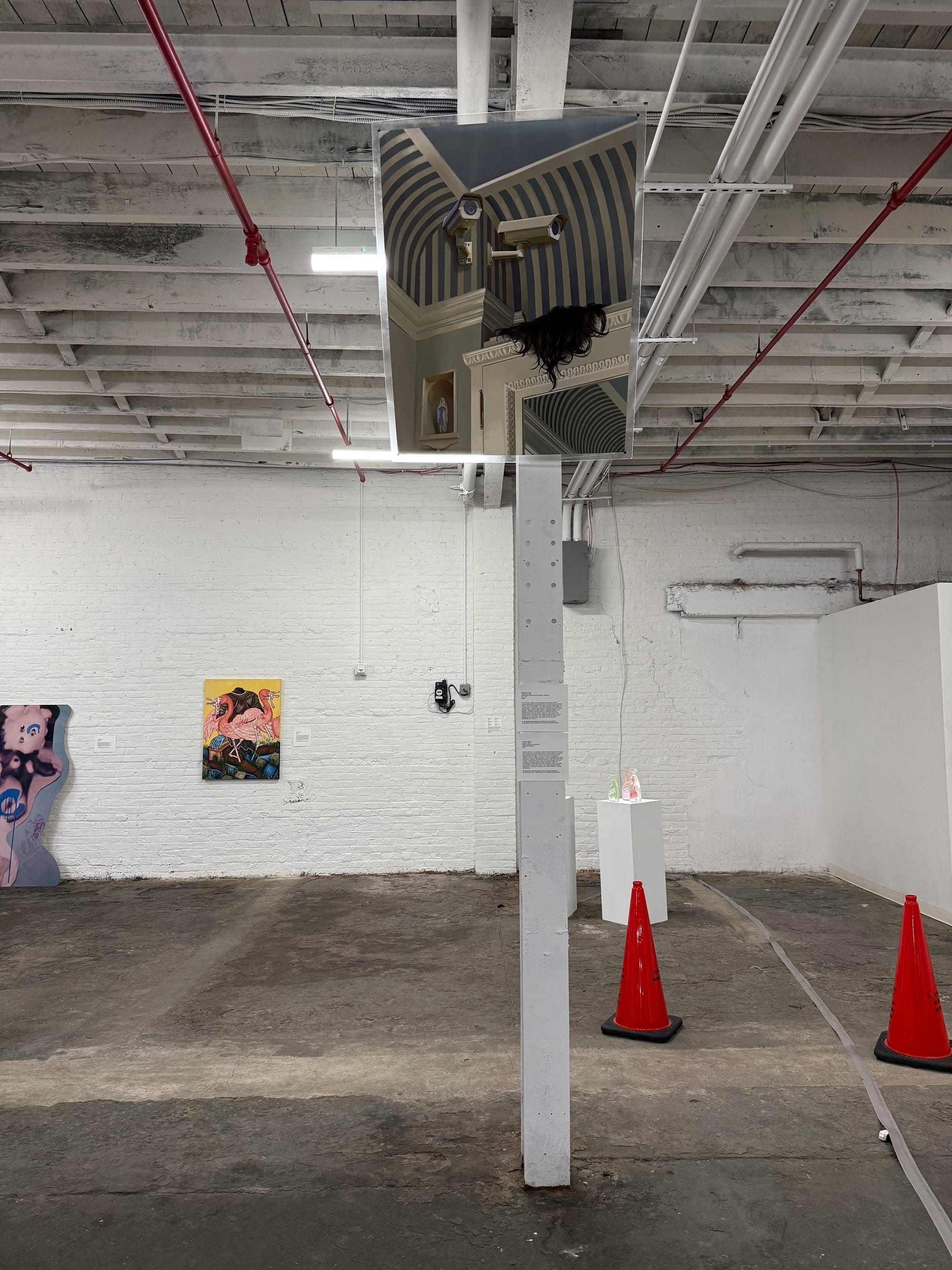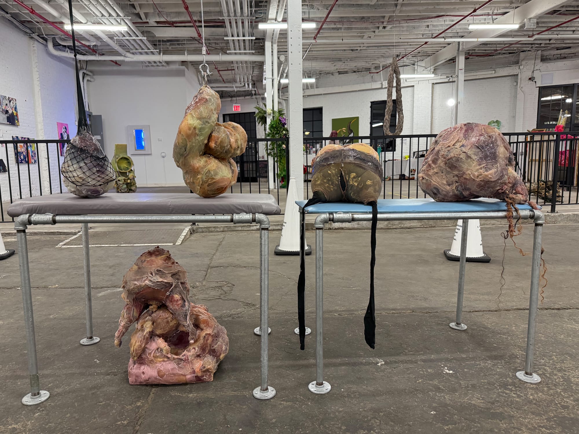 It’s fitting that this exhibition occupies an interstitial space: a room a developer friend of the curators allowed them to use before it’s inevitably rented out — this is waterfront property in New York City, after all. Like a weed sprouting between the cracks in pavement, the exhibition asserts a living, corporeal presence that refuses elimination against all odds, if only for the moment.