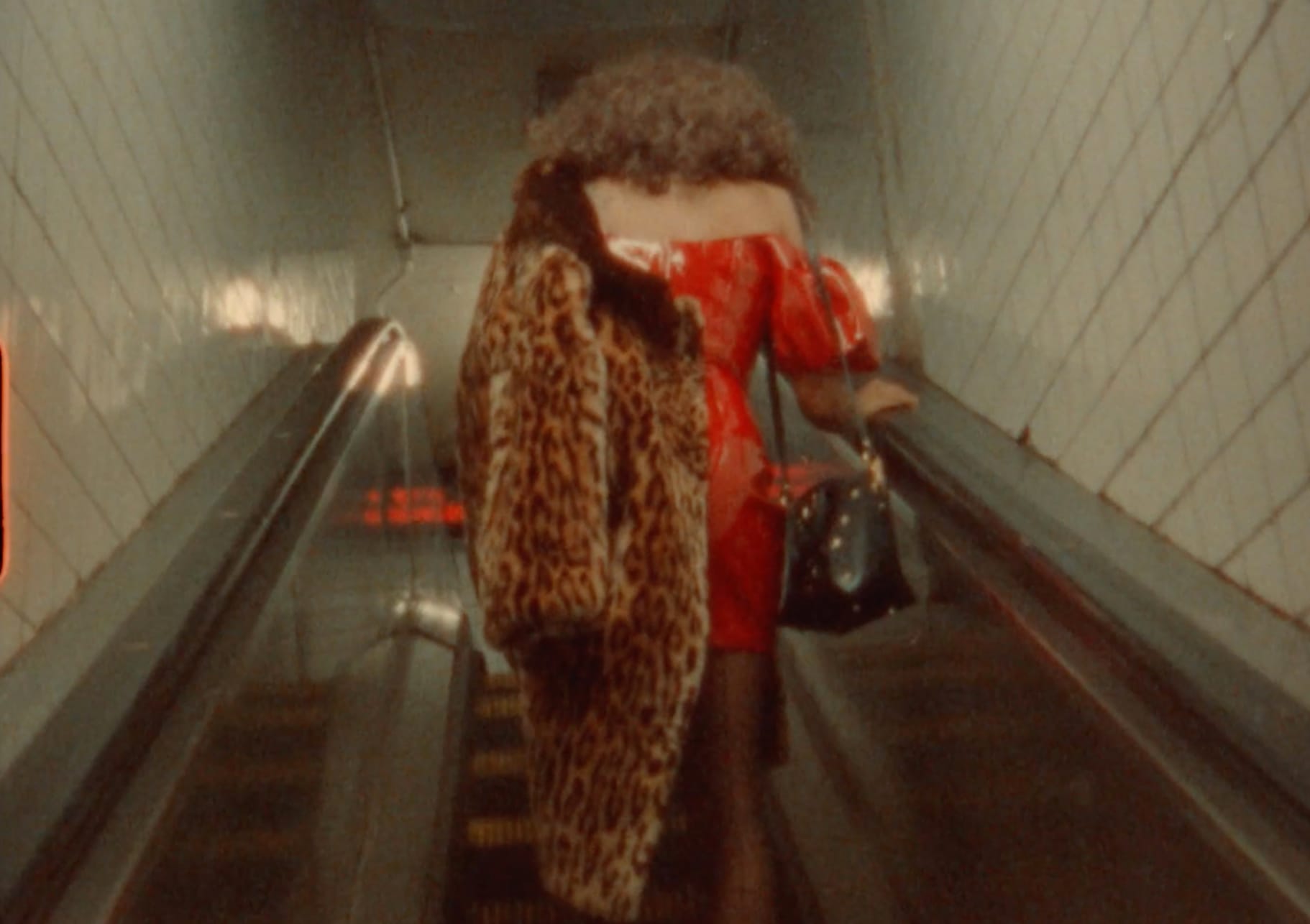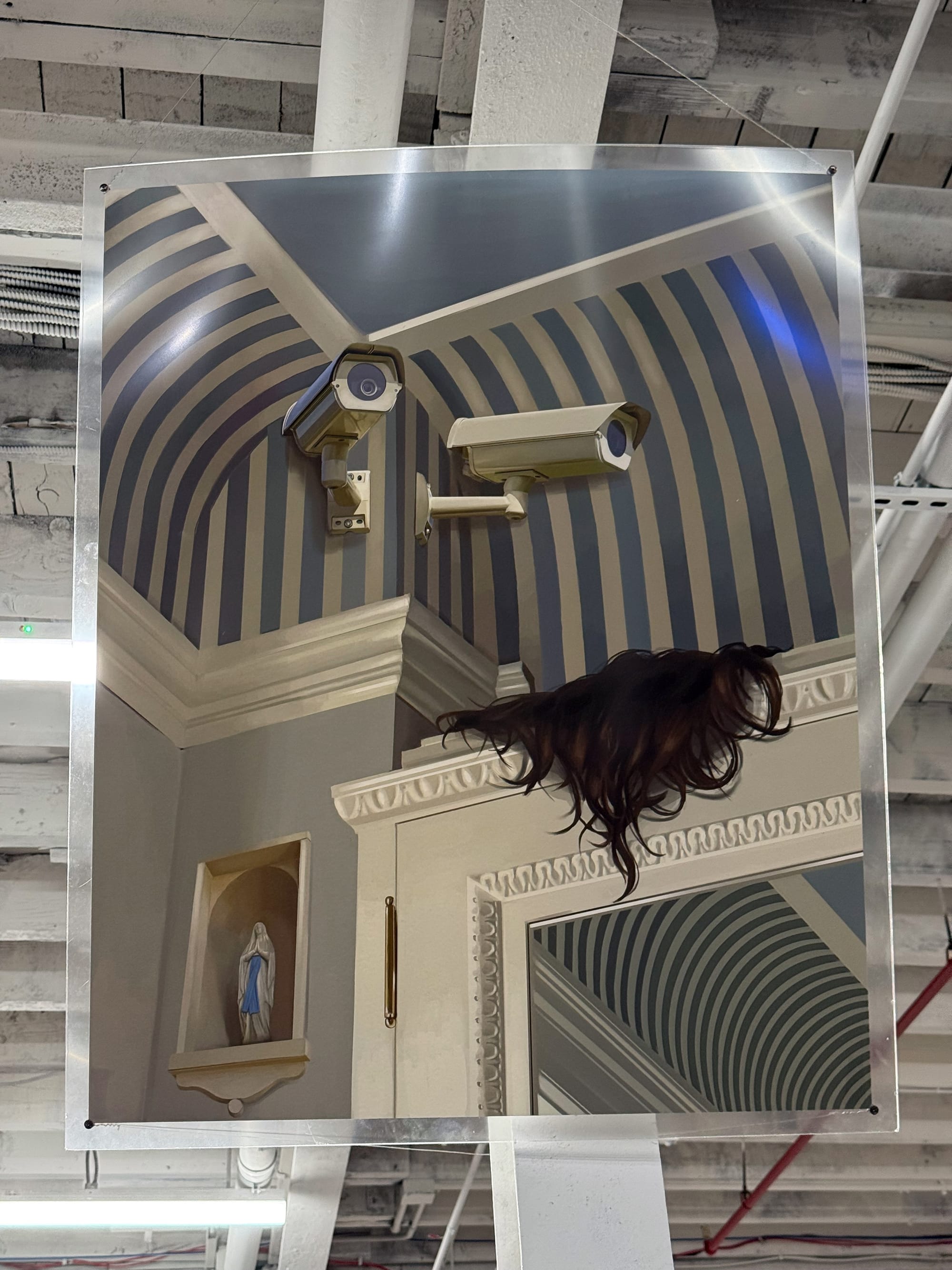 Aliza Shvarts’s “Dark Play” (2025), meanwhile, takes the form of plastic cones arranged in a large ring, each printed with a numbered text about bodily autonomy (or lack thereof), drawing the viewer into a kind of spellcasting: silently voicing incantatory phrases while moving in preordained patterns across time and space. A long line of duct tape on the floor leads you out of the main gallery with the storybook instruction to “follow the yellow brick road to the media room.” Inside, Ayanna Dozier’s 16mm film “Nightwalker” (2022) creepily follows a sex worker up a subway escalator, the video’s soft glow in the dark creating a sense of wandering through a red-light district. And for good measure, the sound of a crying baby starts up every now and again back in the main gallery (Lena Chen, "Full Circle," 2022), awakening some bodily instinct within me that I often forget I have.