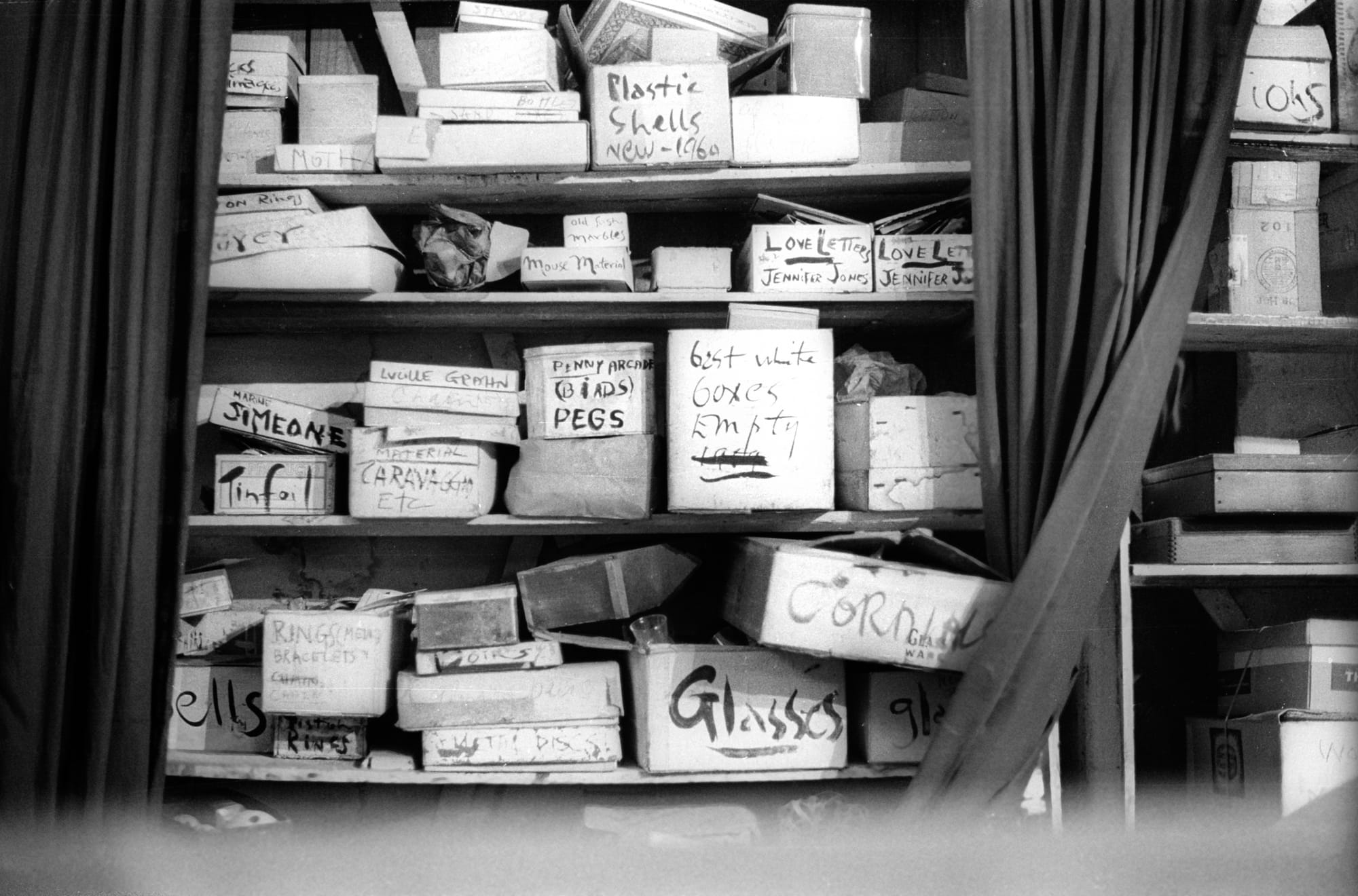 Works including “Pharmacy” (1943), “A Dressing Room for Gille” (1939), and “Flemish Princess” (c. 1950) physically command visitors' attention as they sit below eye level on scrappy wooden tables up front. In the background, dozens upon dozens of cardboard boxes labeled in Cornell's painted lettering are crammed into a ceiling-high bookshelf. At another corner of the studio below shelves of collected curios, inspirational ephemera are haphazardly strewn across a table equipped with a typewriter, wood glue, ink jars, and a painted wooden parrot, among other needful tools.