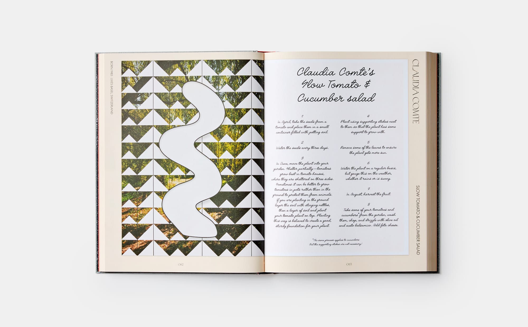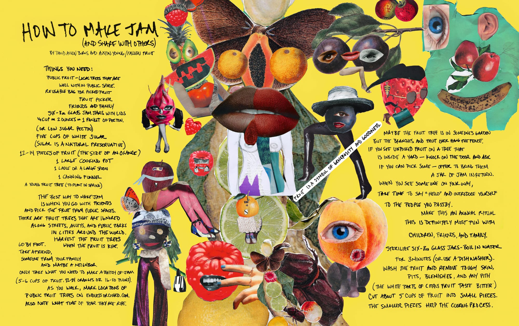 Some of the book’s participating artists — like Martha Rosler and Rirkrit Tiravanija, who contribute Patriotic Jell-o Gelatin Salad and Thai curry pizza recipes, respectively — have long worked with food and cooking in their practices. Others take an unexpected spin on the concept. Studio Olafur Eliasson, for example, instructs readers about food-based pigments, while David Horvitz’s mushroom soup recipe lists “foggy morning” and “wandering in a forest,” alongside butter and onion, as ingredients. In “Two Cherries,” Nicholas Party directs readers to select a sunny July afternoon to walk around the countryside, find two cherries, and spit the stones as far as possible.