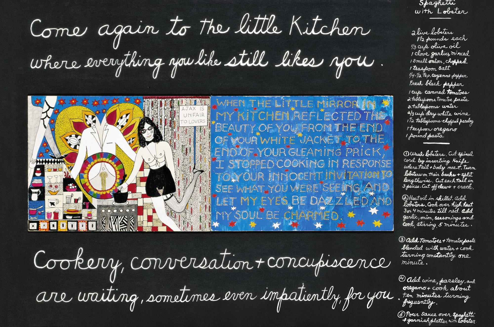 Eamon Ore-Giron’s and Danh Vo’s entries both entail hours- and days-long processes. Others incorporate unconventional ingredients: Bernar Venet makes a meal of lamb brains, and Shimabuku learns to prepare kuchiko (dried sea cucumber ovaries). Abraham Cruzvillegas gives a linguistic and historical meditation on guacamole, while John Lyons writes, “I see no difference between painting a picture, writing a poem, or cooking a delicious meal.” Emily Jacir’s cacio e pepe requires only three ingredients, while Vik Muniz advises those who try his ravioli all’uovo recipe to use “as much white truffle as you can afford,” putting the age-old stereotype of the starving artist aside.