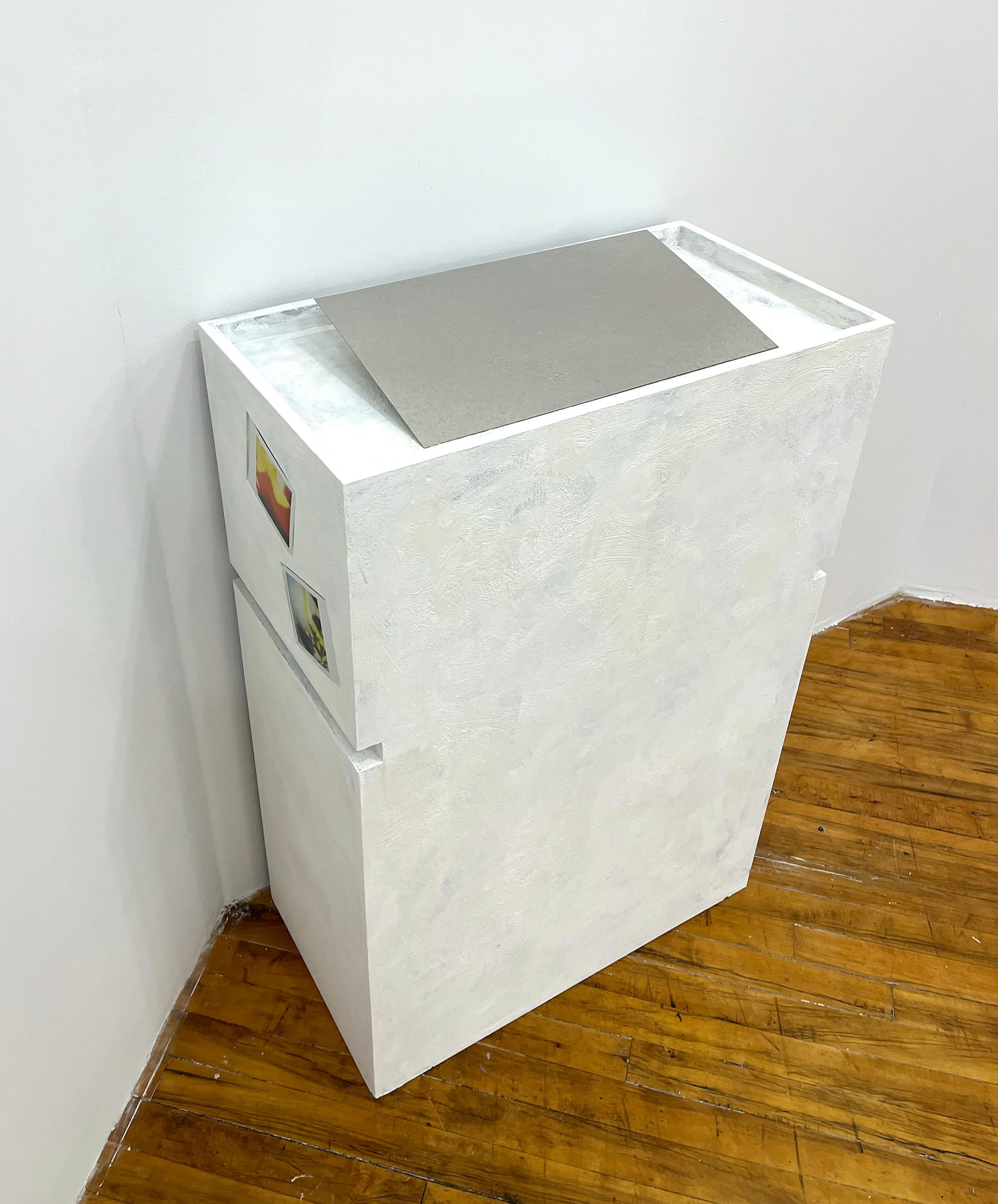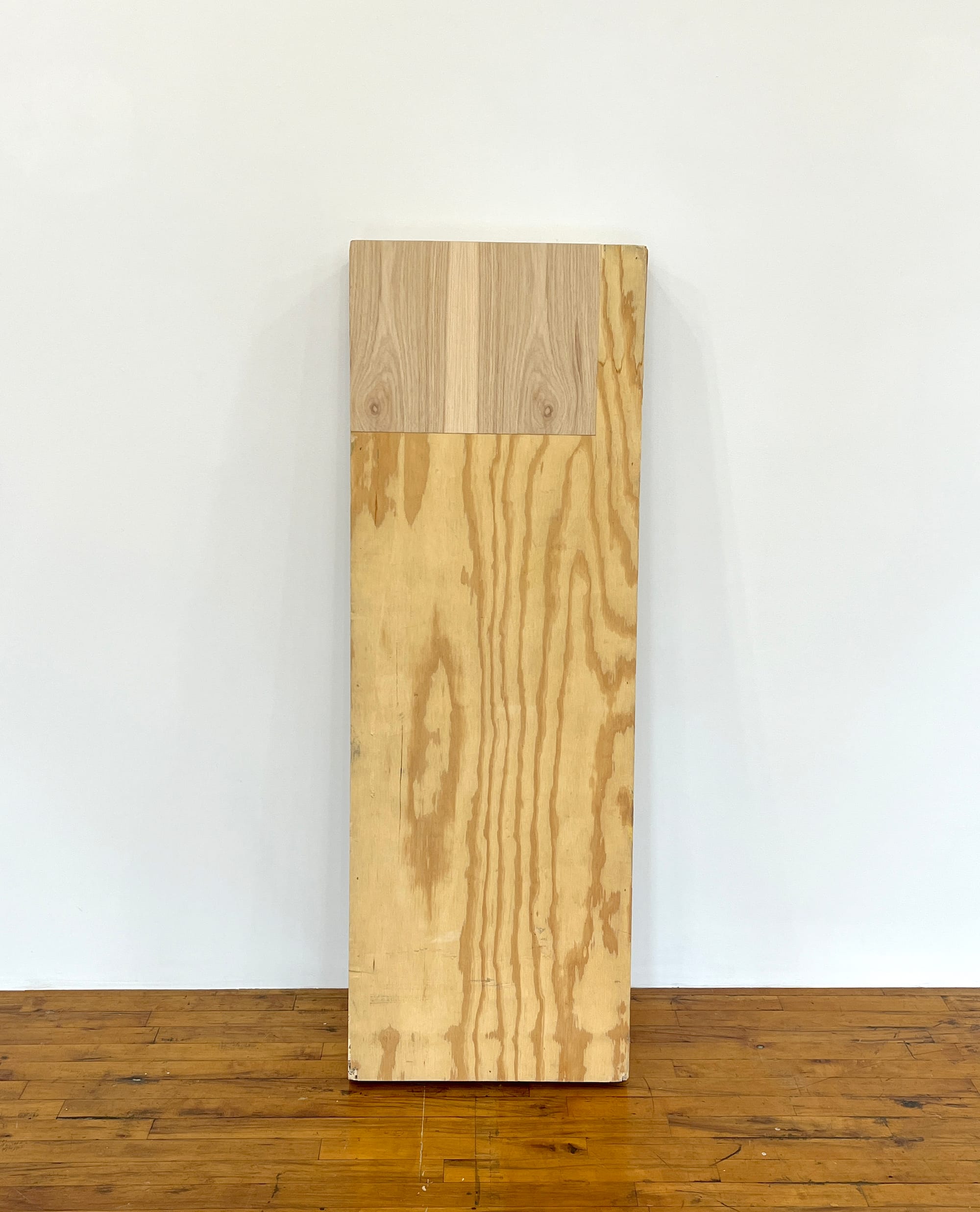 Humor bubbles up in some of the other works on display. Linn P. Meldt’s “Á conter en le trottoir” (2024) is comprised of cast silicone and flower petals, “with sidewalk residue.” What could be less Instagrammable? And how to distinguish the flower petals from the dirt and waste and disintegrating trash that have merged into residue? Anna Campbell’s “Chest” (2022) is more coy in its humor. Composed of plywood, pine, and a rectangle of hickory veneer, that odd imposition of veneer on top of plywood, itself made up of layers of veneer, begs all sorts of questions. Does the title reference anatomy or furniture? The artist’s layering and editing projects both playful and serious dimensions. Given Campbell’s interest in queerness, “Chest” suggests the ways that the bodies of queer and cis people alike change, intentionally and over time, and our society’s very different readings of those changes across identity groups.