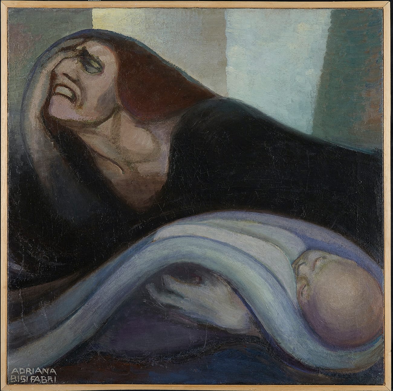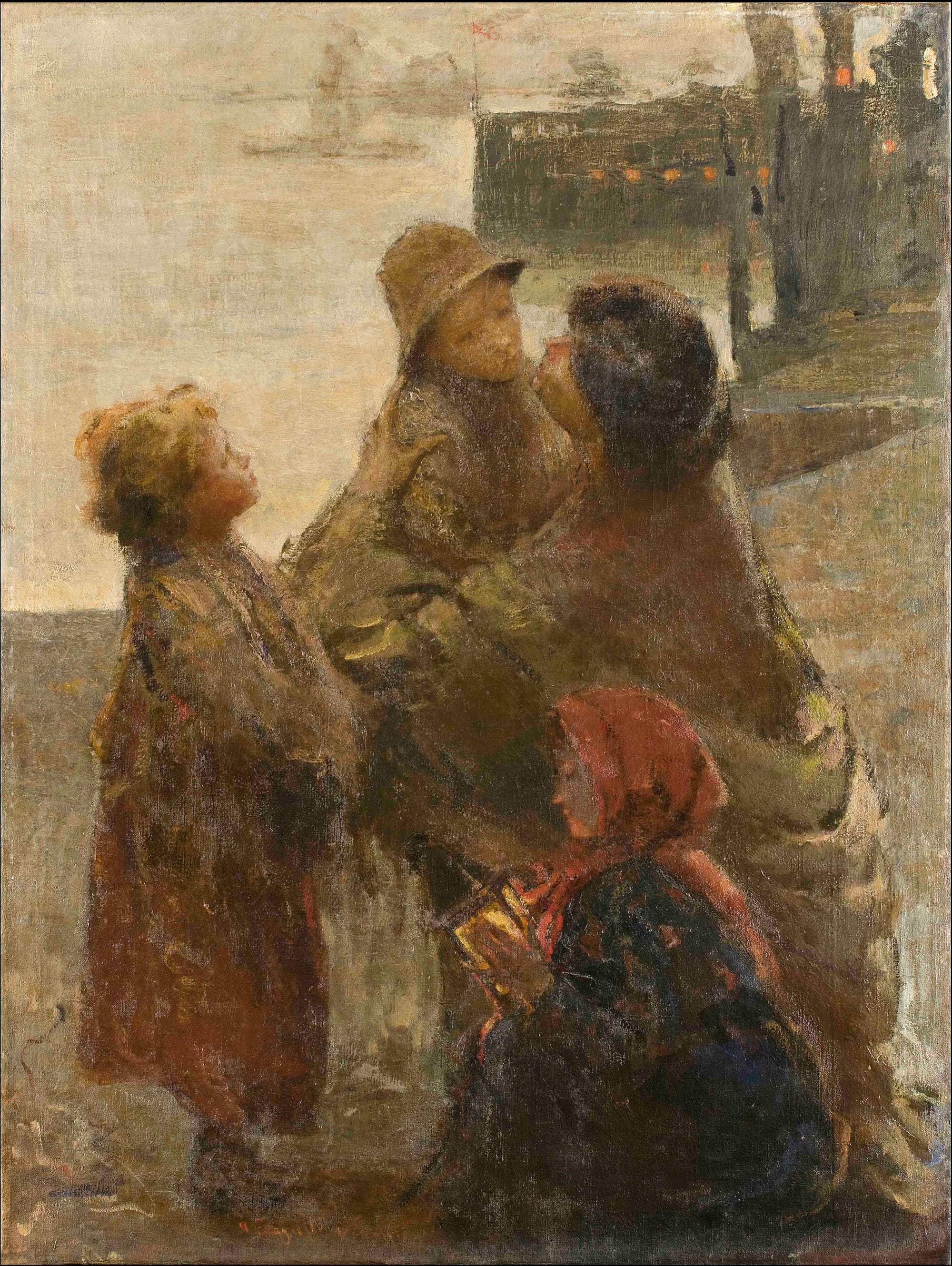 Ambrogio Alciati’s “The Miner” (1907) portrays the dead worker in a Pieta-like composition perhaps borrowed from Venetian sacred images. Adriana Bisi Fabbri’s “Mother”(1917) depicts a grieving mother in a style recalling the fin-de-siecle Symbolists. Emilio Longoni’s “Reflections of a Starving Man” (1894) shows a poor man on the street watching an entitled couple dining inside in a restaurant. Giacomo Balla, who later gained fame as part of the Italian Futurist group, contributes “Cycle of the Living. The Peasant” (1902), a naturalistic image of an impoverished worker. Raffaello Gambogi’s “Emigrants” (1894) centers on a group of people ready to embark in Liverno. And another work by Longoni, “The Orator of the Strike” (1891) depicts a militant activist, holding onto a lamppost suspended high above the crowd to which he speaks.