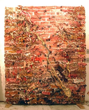 Marcaccio gets his sources from the Internet and newspapers. One painting is titled “Breaking News” (2011). Another is “Brick Painting” (2011), where the holes in the undulating silicone surface suggest the aftermath of a firing squad. Other subjects include the confrontations at Ruby Ridge and Waco, the mob killing of four American contractors at Fallujah, and the massacre at Columbine High School. The recurring subject is the repeated and insistent destruction of the human body.