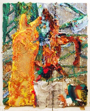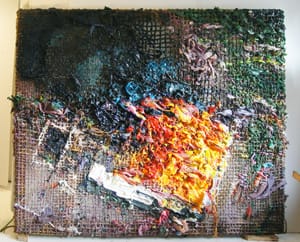The colors get suspended within each other, rather than mixing together. The silicone is a mutant offspring of paint. It never loses shape. The shiny materiality is both seductive and off-putting. The colors can be ramped up. Because it can resemble oil paint, one is able to forget that the painting is made of silicone. We may recognize that “Waco” (2011) is an aerial view of burning house, with billowing, oily smoke rising into the air, but the bulbous extrusion of red, orange, and yellow silicone dissolves the boundaries between representation and abstraction, and between the visual and physical. We are looking at fire and dense clusters of red, yellow, and orange bubble-like forms.